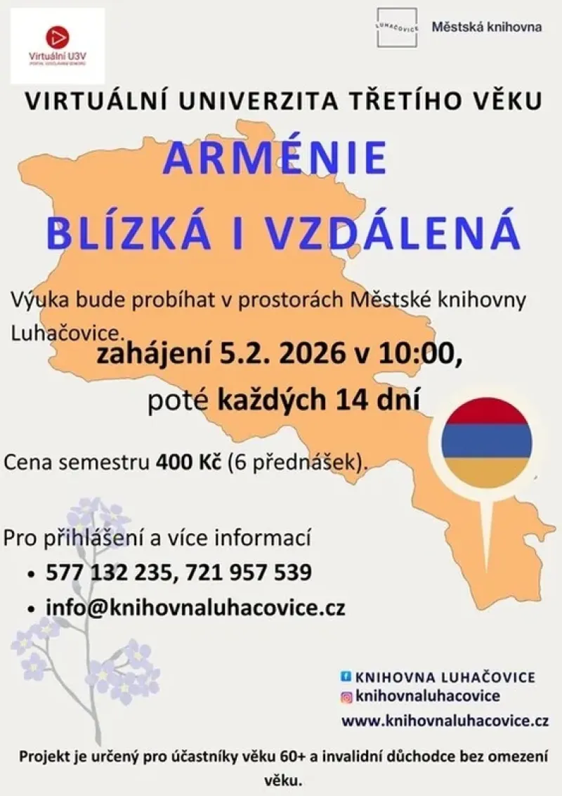 Ve ČTVRTEK 5.2. 2026 od 10:00 proběhne slavnostní předání certifikátů absolventům zimního semestru virtuální univerzity třetího věku. V tento den bude zahájen i nový semestr, jehož tématem je ARMÉNIE BLÍZKÁ I VZDÁLENÁ. Všechny zájemce zveme na nezávaznou první hodinu, po níž se můžete rozhodnout, zda budete v lekcích pokračovat. Semestr má celkem 6 lekcí, které se konají každých 14 dní ve čtvrtek. Zájemci NEMUSÍ být čtenáři knihovny. Úplata za semestr je 400 Kč.