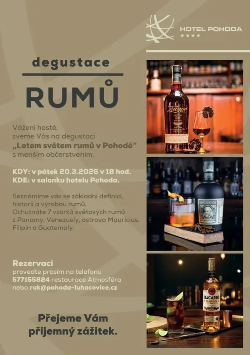 Hotel Pohoda zve na degustaci "Letem světem rumů v Pohodě" s menším občerstvením.