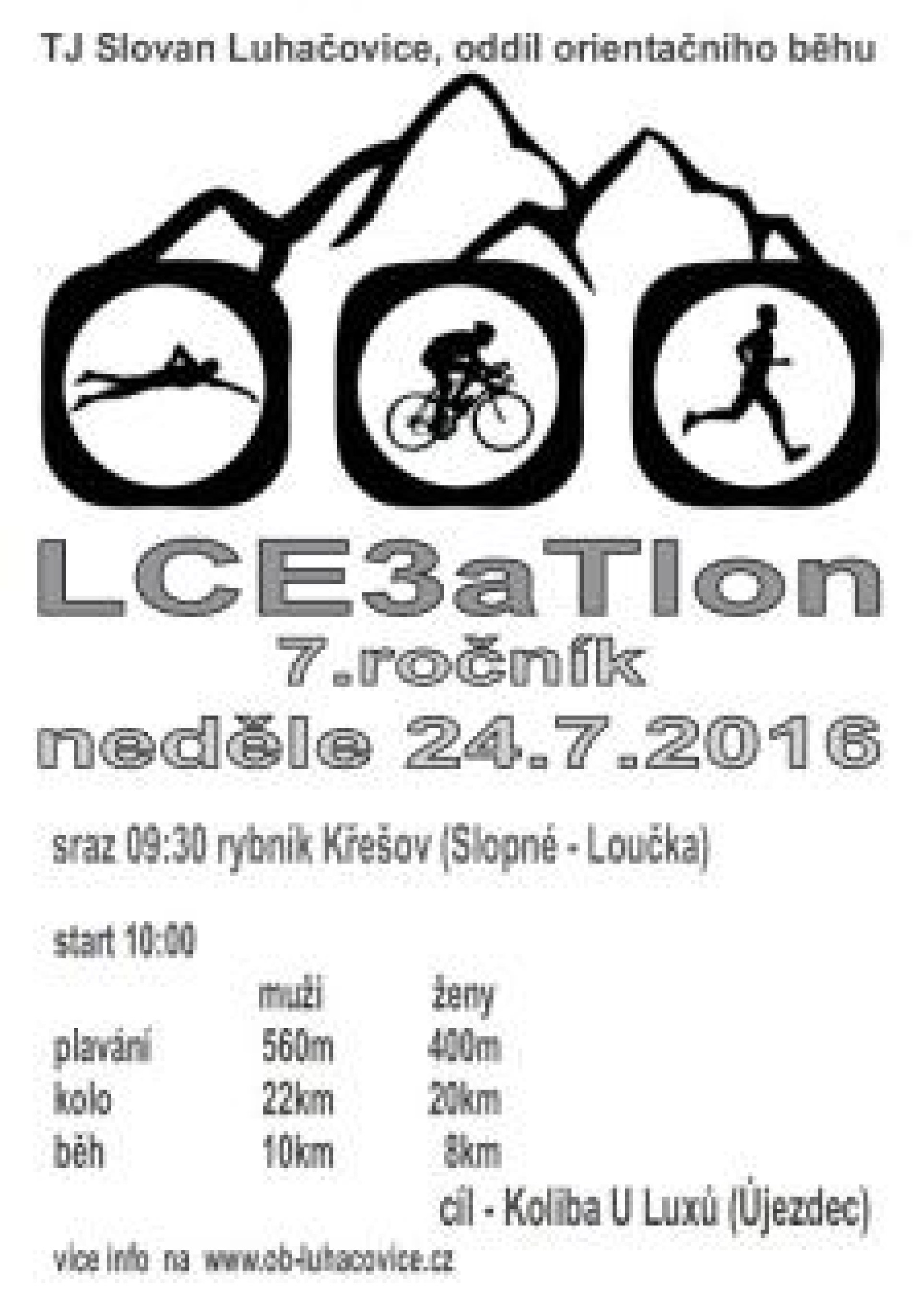 Trasa 7. ročníku akce LCE3aTlon proběhne na obvyklé trati se startem na rybníce Křešov u Slopného, kde proběhne plavecká část. Odtud vyrazí závodníci jako cyklisté k Luhačovicím. Z centra Radostova (v případě žen z depa na kopci nad centrem) budou pak účastníci pokračovat během do cíle, který je v kolibě U Luxů v Újezdci. Video z Loňského ročníku, kterého se zúčastnil i známý ironman Petr Vabroušek, je k vidění na http://www.luhacovice.cz/27252n-video-sesty-rocnik-lce-triatlonu-absolvoval-i-legendarni-petr-vabrousekPLAKÁT AKCE