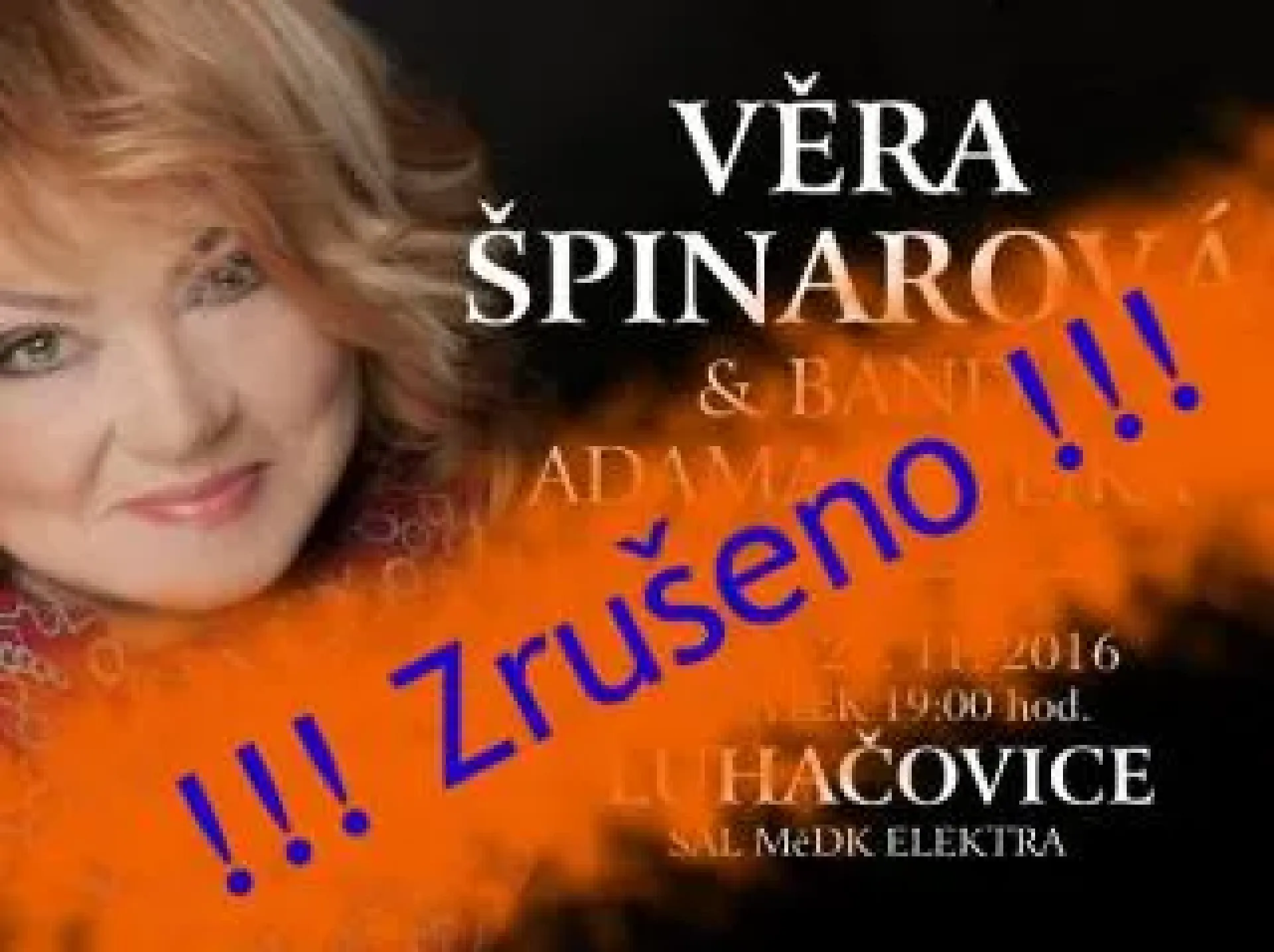 Vyprodaný koncert Věry Špinarové, který byl v Městském domě kultury Elektra Luhačovice naplánován na středu 23. listopadu musel být z důvodu nemoci zpěvačky zrušen.