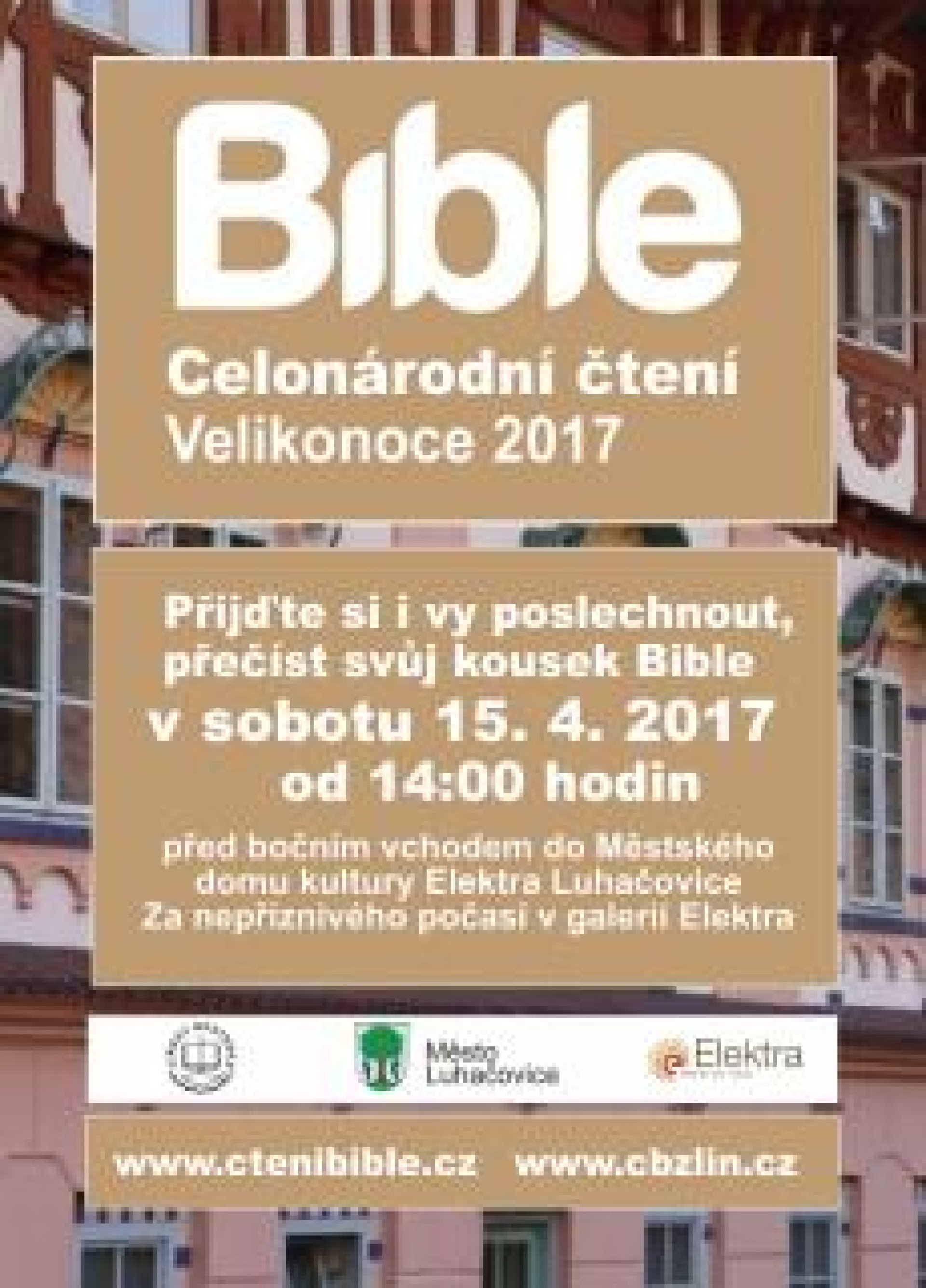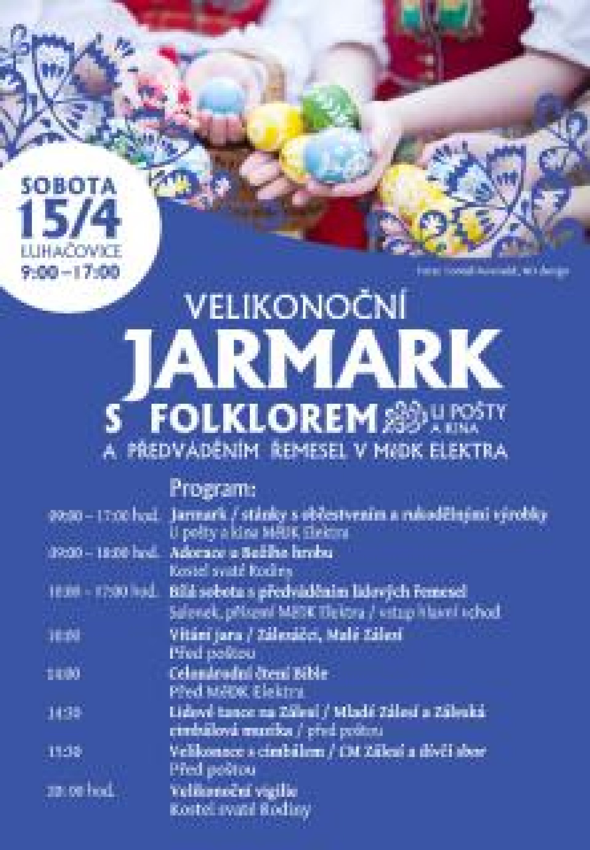 Nabídne jako obvykle mnoho stánků s řemeslnými výrobky i spoustou dobrého jídla a pití. Nebude chybět ani folklorní vystoupení a předvádění tradičních řemesel v salonku domu kultury Elektra a akce je opět spojena i s Celonárodním čtením bible. Gabriela Gergelová, která má za Městský dům kultury Elektra organizaci jarmarků ve městě na starost, upozorňuje, že vzhledem k ne zcela ideální předpovědi počasí, se v případě deště mohou některé programy plánované do venkovních prostor přesunout pod střechu. "Folklorní vystoupení by se místo na podiu v ulici Dr. Veselého přesunulo do hlavní vstupní haly kulturního domu, která je vedle restaurace Elektra. Čtení bible by se odehrálo v galerii Elektra," poznamenala Gergelová. Lidé každopádně mohou zavítat ktaké na předvádění řemesel, které je plánováno do salonku poblíž stupní haly kulturního domu Elektra, kde se deště rozhodně bát nemusejí. "Mezi předváděním řemesel tam nebude chybět například ukázka práce s kolovrátkem a lidé se v těchto prostorách budou moci mimo jiné dozvědět také více o pečení skvělých mazanců a jarního chleba od zručné pekařky, paní Pechové. Ta bude kromě mazanců nabízet například chléb s kopřivami nebo dýňovými semínky," doplnila Gergelová. Plakáty k akci