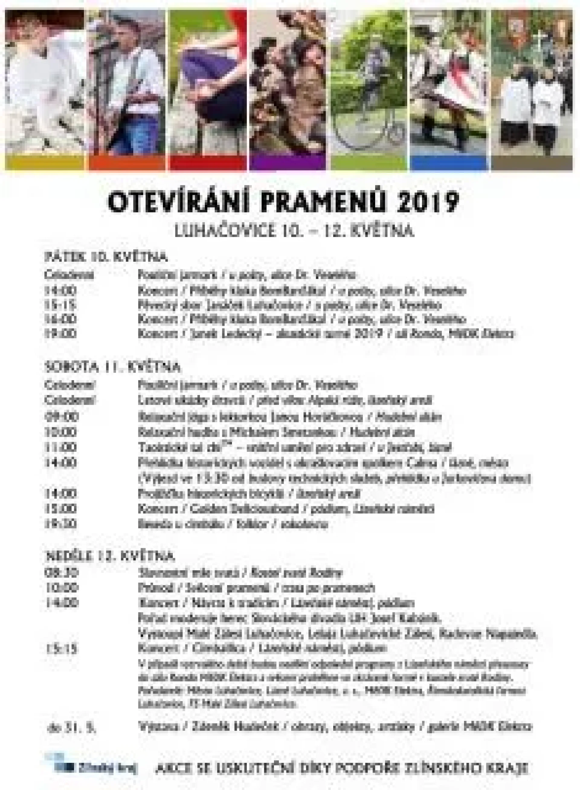 „Tentokrát se bude konat jarmark doplněný různými kulturními vystoupeními nejen v sobotu, jak tomu bývalo zvykem, ale také v pátek,“ upozornila dramaturgyně akce Regina Bittová. Jarmark nabídne v části ulice Dr. Veselého u pošty nejen možnost občerstvení nebo nabídku rukodělných výrobků, ale v pátek i sobotu také zpěv takzvaných kramářských písní, které byly v historii na nejrůznějších jarmarcích velmi oblíbené. „Kramářské písně a flašinety představí po oba dny Zdeněk Polášek, ale v pátek také rodina Nemravova z Uherského Hradiště,“ poznamenala Bittová. V pátečním programu Otevírání pramenů nebude chybět ani večerní koncert Městském domě kultury Elektra. „Od půl osmé vystoupí brněnská kapela Cimballica. Ta je zastoupením nástrojů blízká cimbálové muzice, hraje ovšem často různé melodie populární a filmové hudby v nevšedních aranžmá. Cimballica se tak inspiruje například fenomenálním skladatelem filmové hudby Ennio Morriconem, ale třeba i kapelou Metallica,“ nastínila Bittová. V sobotu návštěvníci mohou zajít opět na jarmark, který ale začíná oproti pátečním 10 dopoledne již o hodinu dříve, ovšem potrvá rovněž do 17 hodin. Ani letos nebude chybět v druhý den Otevírání pramenů řada programů na Lázeňském náměstí. „Hlavními hvězdami programu budou odpoledne legendární zlínská hudební skupina AG Flek a také na jevišti u Společenského domu sehrané divadelní představení Commedia dell´arte, ve kterém se představí mimo jiné Tatiana Vilhelmová a Pavel Liška,“ sdělila dramaturgyně akce. U Lázeňského náměstí ale bude živo po celý den. Dopoledne bude možné navštívit workshop a koncert world-music skupiny Afrikana. „Tato skupina rodilých afrických hudebníků avizovaná v programu Otevírání pramenů původně už vloni tehdy bohužel kvůli autonehodě nemohla do Luhačovic dorazit. Letos si tedy jejich muziku návštěvníci Otevírání pramenů budou moci konečně užít,“ doplnila Bittová. Na travnaté ploše nedaleko vily Alpská růže poblíž Lázeňského náměstí bude situována už od dopoledne prezentace dravých ptáků Stanice ochrany fany z Hluku. A po Lázeňském náměstí se samozřejmě odpoledne budou pohybovat také členové spolku Calma v historických kostýmech. Ani tentokrát nebudou však chybět historická kola a automobilové veterány. „Ty vyjedou ve 13:30 od hasičské zbrojnice směrem k centru města, odkud tradičně zamíří do lázeňského areálu. Letos budou ale potom vystaveny ne jako obvykle poblíž Jurkovičova domu, nýbrž u Domu Bedřicha Smetany alias hotelu Popper ze známého seriálu Četníci z Luhačovic,“ doplnila Bittová. I letos nebude v programu chybět natáčení rozhlasového Toboganu ve Společenském domě, ale třeba také oživlé sochy, které představí na Lázeňském náměstí Body painting Sinela, studio mistryně ČR v bodypaintingu. Letošek nabídne i jednu velmi zajímavou akci, která se uskuteční v sobotu od 19:30 v kině Elektra. „Návštěvníci se tu mohou těšit na besedu s projekcí filmu Divoké Včely, za účasti režiséra Bohdana Slámy a také herců, mezi nimiž lze jmenovat například P. Lišku, M. Daniela nebo T. Vilhelmovou,“ podotkla dramaturgyně akce.Luhačovické Otevírání pramenů tradičně vyvrcholí jejich svěcením. V neděli 14. května po slavnostní mši v kostele svaté Rodiny vyrazí průvod se zpěvem a muzikou místních folklorních souborů po nejznámějších luhačovických pramenech, které posvětí zdejší farář. U zřídel se přitom představí v době od 10 do 12 hodin hostující folklorní soubory. „Odpoledne se pak všechny společně představí na Lázeňském náměstí od 15 hodin v programu Návrat k tradicím,“ doplnila Bittová. Letošního ročníku se zúčastní folklorní soubory Kopaničiar Myjava, Šmykňa Ostrava, Mladá Haná Velká Bystřice, Old-star Rozmarýn Újezdec, Leluja Luhačovské Zálesí a Malé Zálesí Luhačovice.Všichni, kdo mají rádi Luhačovice a zdejší zahájení lázeňské sezóny, jistě věří, že akci podpoří nejen skvělé výkony vystupujících interpretů, ale také příznivé počasí. „Tak jako v předešlých ročnících Otevírání pramenů ale pro jistotu počítáme samozřejmě i s takzvanou mokrou variantou, při které se v případě vytrvalého deště budou hlavní programy z Lázeňského náměstí přesouvat do Městského domu kultury Elektra a nedělní svěcení by se případně konalo ve zkrácené formě v kostele svaté Rodiny a v hale Vincentka,“ vysvětlila Bittová.Na pořádání akce se jako obvykle společně podílejí město Luhačovice, Lázně Luhačovice, a. s., MěDK Elektra, Římskokatolická farnost Luhačovice a FS Malé Zálesí Luhačovice. „Otevírání pramenů také finančně podpořil Zlínský kraj,“ uzavřela Bittová. Další informace:Ing. Hana Slováková, ředitelka MěDK Elektra Luhačovice, e-mail: reditel@mdkelektra.luhacovice.czTel.: 723 332 734 VIDEA Z LOŇSKÉHO ROČNÍKU: SOBOTA - http://www.luhacovice.cz/27526n-x?preview=1 NEDĚLE - http://www.luhacovice.cz/27528n-video-posveceni-pramenu-symbolicky-otevrelo-lazenskou-sezonu-v-luhacovicich?preview=1