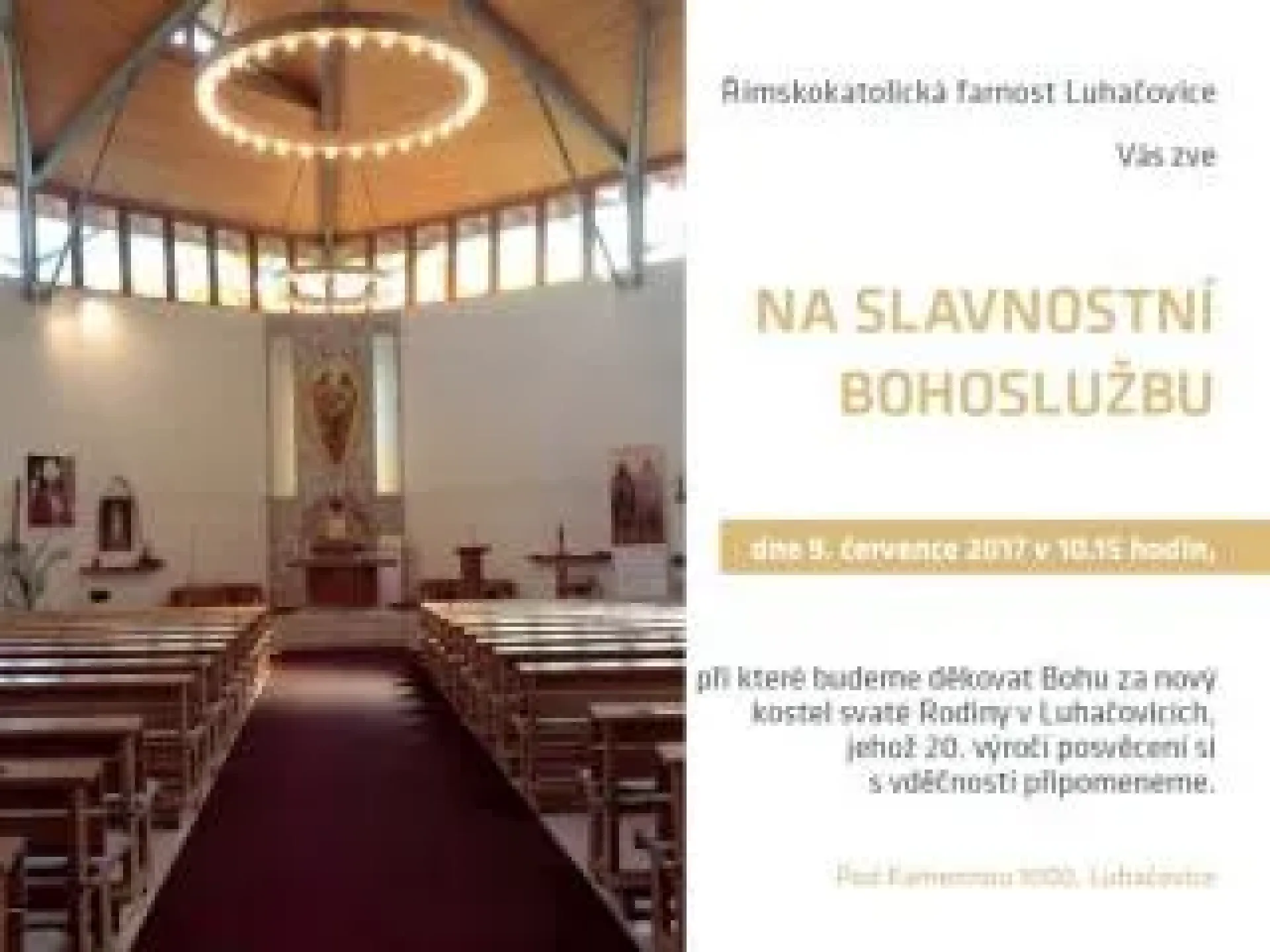 Římskokatolická farnost Luhačovice zve na slavnostní bohoslužbu, při které bude děkovat Bohu za nový kostel svaté Rodiny v Luhačovicích, jehož 20. výročí posvěcení si s vděčností připomeneme. Slavnostní bohoslužba se uskuteční v neděli 9. července od 10:15.