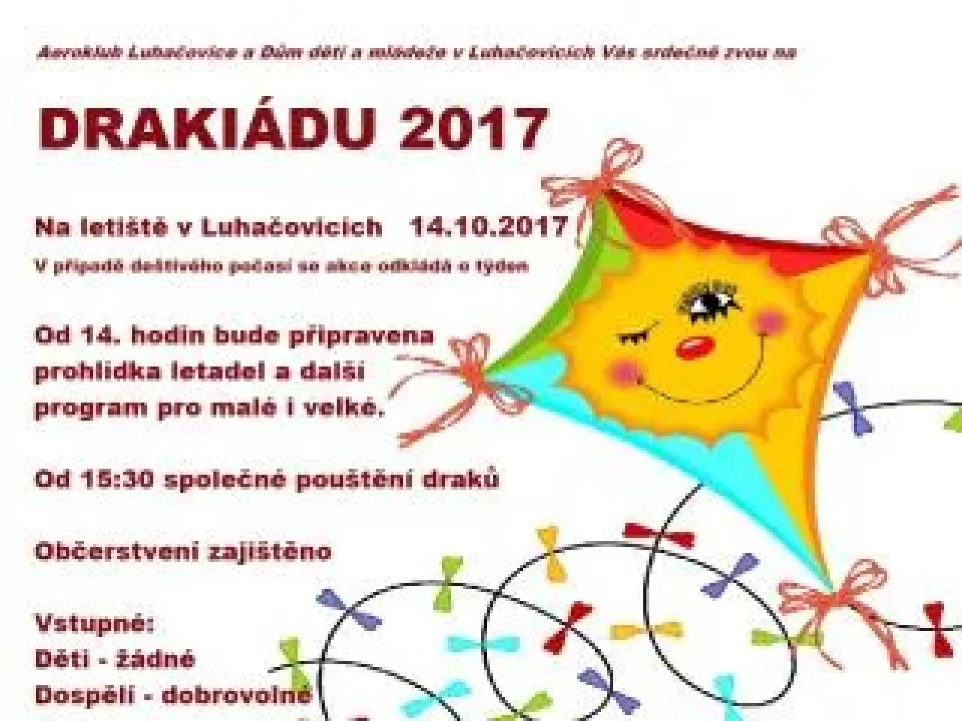Volno v sobotu mohou lidé, zejména rodiny s dětmi, využít k návštěvě drakiády, která se koná na luhačovickém letišti. Součástí bude i prohlídka letadel místního aeroklubu, který spolu s DDM Luhačovice akci pořádá.