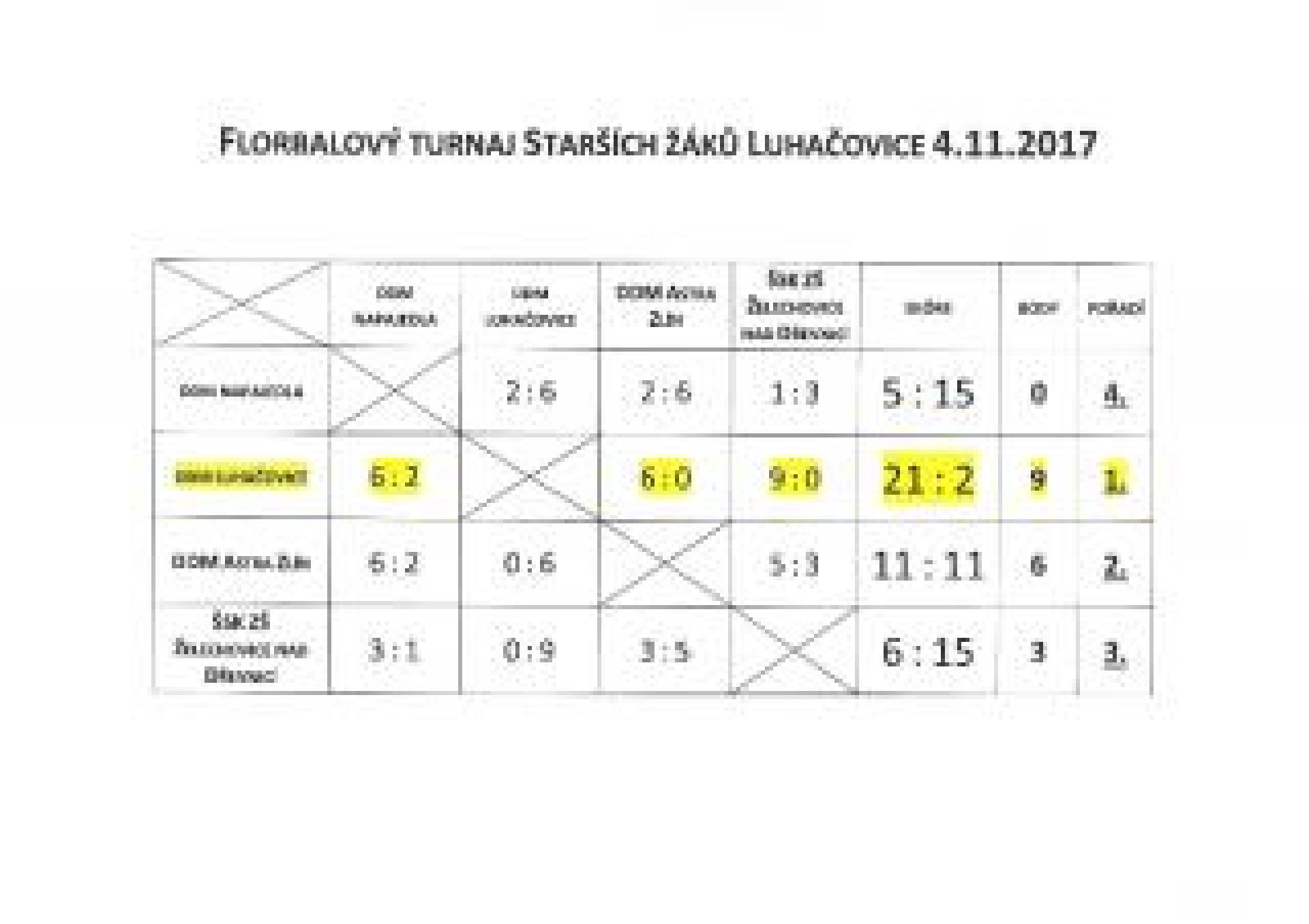 Hráči DDM Luhačovice: Adam Liška – G – vyhlášen jako nejlepší hráč našeho týmu, Matyáš Rumpík - 3góly, Patrik Záhorovský, Patrik Kresta – 3góly, Matyáš Pírek – 1gól, Matěj Horáček 1 – gól, Vojta Mituník, Václav Mituník, Alexandr Caletka, Ondřej Humpola, Adam Vančura, Petr Nášel, Adam Smýkal, Vojta Semela, Samuel ElshennawiV sobotu 4. 11. 2017 se předvedla kategorie starších žáků a musím říci, bylo se na co dívat. Turnaje se účastnili hráči s ročníkem narození 2003 a mladší, hráčky 2002 a mladší. Turnaje se účastnila opět 4 družstva. Domácí DDM Luhačovice, DDM Napajedla, ŠSK ZŠ Želechovice nad Dřevnicí a DDM Astra Zlín.