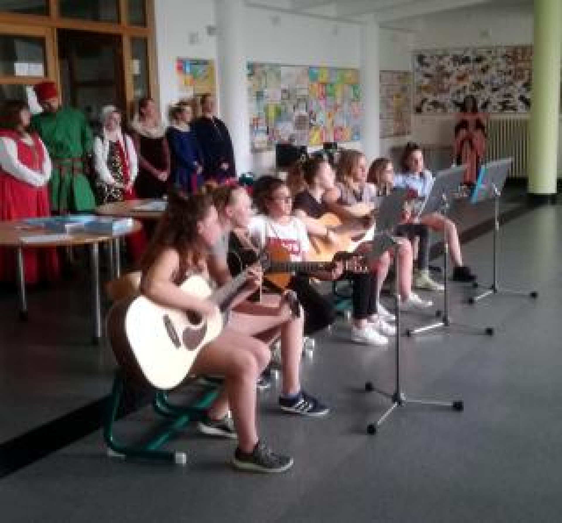 Skupina Vir Fortis se pod vedením Olgy Zbořilové postarala svým tanečním vystoupením o doprovodný program celé akce a nebyli na to sami. Po historických tancích následovalo hudební vystoupení dětí z kroužku Táborová kytara, který patří pod DDM Luhačovice a vede jej Veronika Foxová. Pohádkové písničky mile dokreslily slavnostní atmosféru a jakmile se dozpívalo, děti z prvních tříd jednotlivě poklekaly před rytíře a po krátkém pasovacím obřadu získaly šerpu, knihu z projektu „ Už jsem čtenář“ a hlavně – roční registraci do knihovny zdarma.Nesměl chybět ani krátký proslov ředitele školy Mgr. Romana Leblocha a celé Pasování na čtenáře by nebylo dokonalé, kdyby malí školáci neukázali, co umí. Jejich krátké vystoupení nadchlo všechny přítomné rodiče i další příbuzné a děi si užívaly zaslouženého potlesku.Děkujeme všem přítomným za účast, ochotu a vstřícnost s jakou se s námi do přípravy projektu vždy zapojují.Francouzský spisovatel Mauriac jednou řekl : „ Četba jsou otevřené dveře do kouzelného světa“. Věříme, že jsme tyto tajemné dveře pomohli otevřít dalším nadšeným čtenářům. FOTOGALERIE: