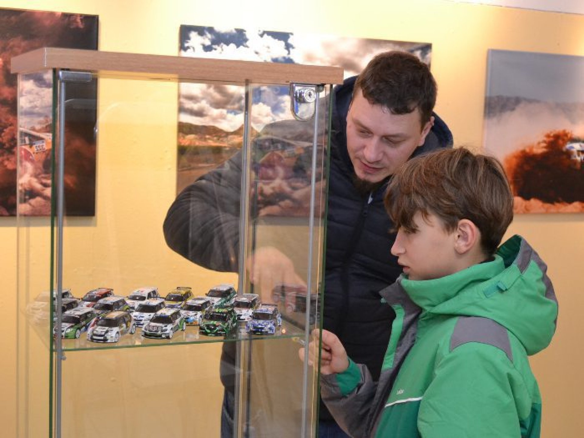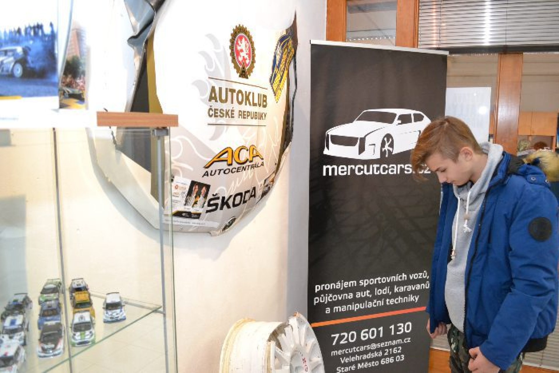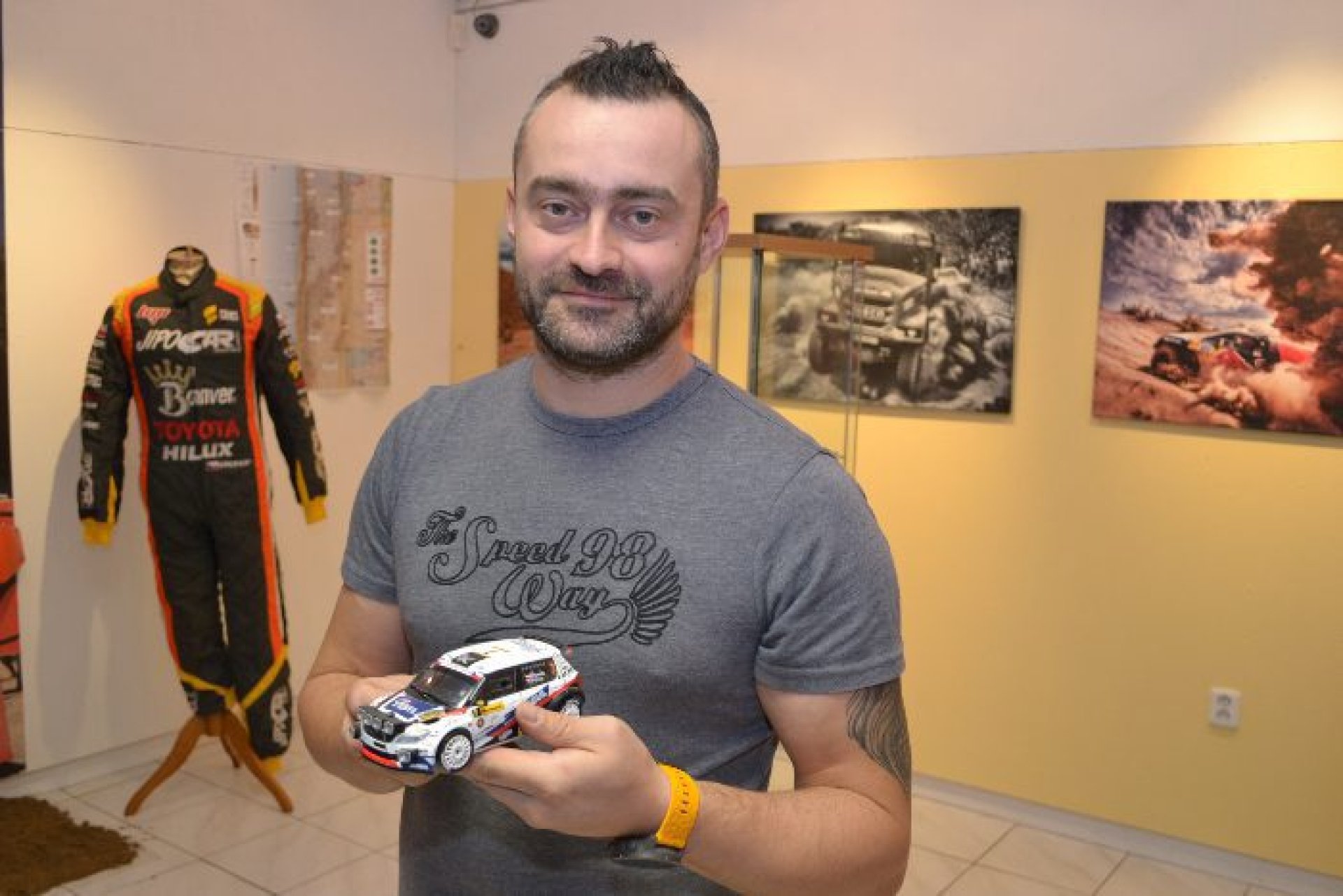 V expozici jsou ale i reálných závodních aut a zajímavé fotografie. „Fotky jsou zapůjčené od zlínského fotografa Ondřeje Záruby, mapují některé z ročníků Dakaru. Pak tu máme jednu kapotu Škody Fabia R5 týmu Kresta racing. Kapota byla na vozu Filipa Mareše na letošní Barumce. Jednu z posledních rychlostních zkoušek Mareš s autem kvůli jezdecké chybě naboural. Z té havárie je i rozbitý disk kola, které tu máme. Je tu ale i originální nárazník z Fordu Fiesta WRC, z roku 2013. Také originální kombinézu Martina Prokopa, ve které jel s Toyotou Hilux na rally Dakar. Je tu i další kombinéza Martina Macíka, který jezdí Dakar v kategorii kamionů,“ doplnil Bartoníček.