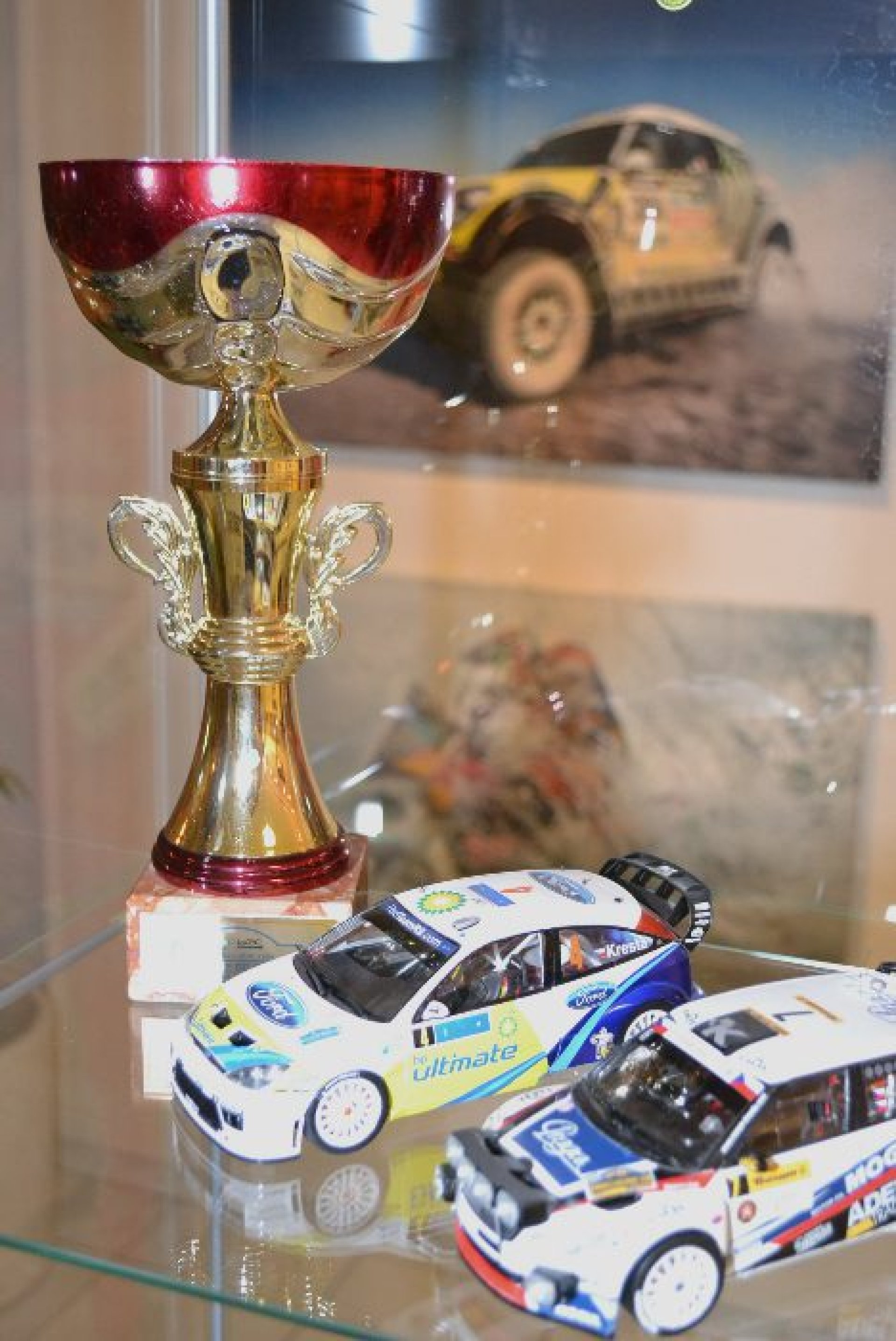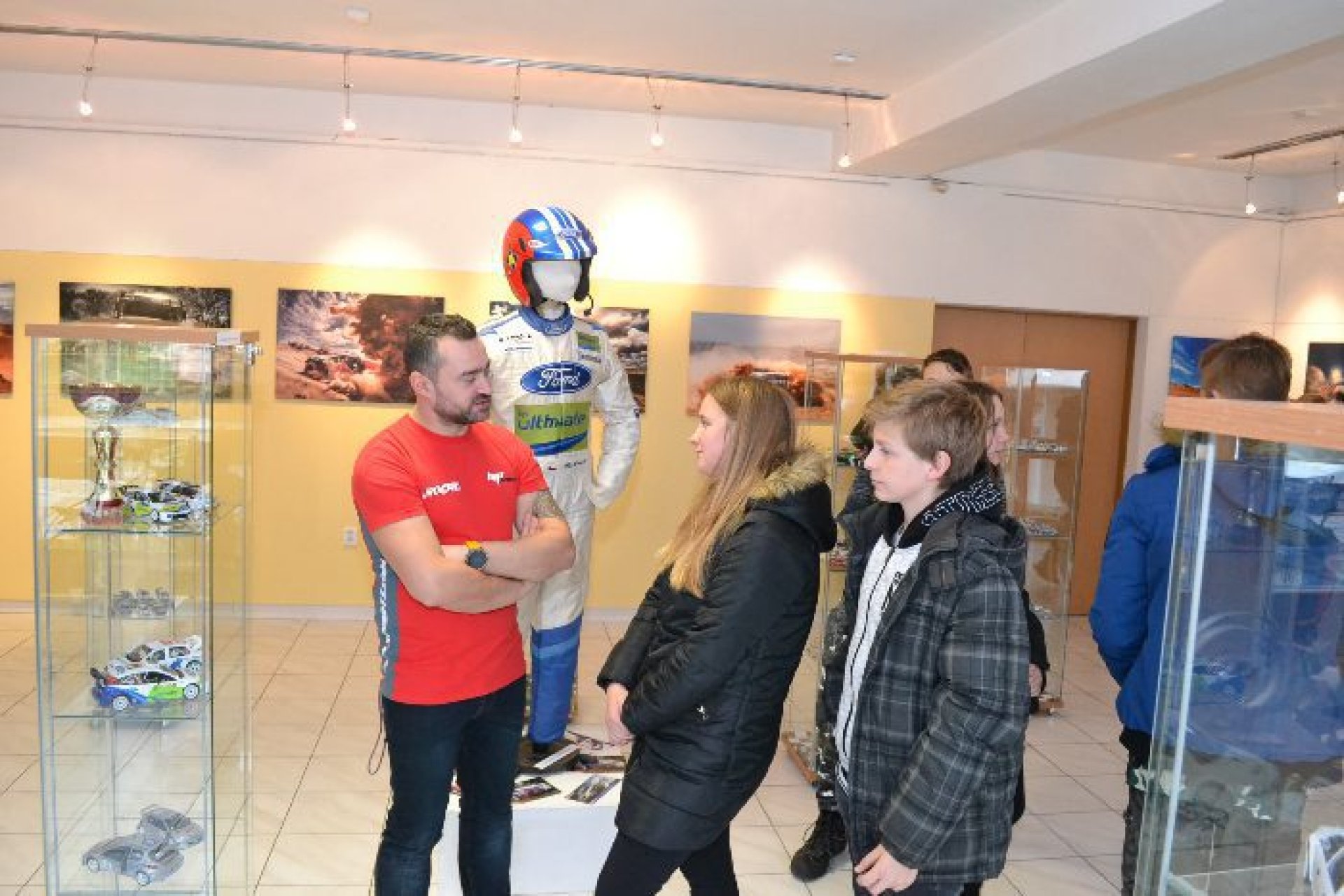 Na výstavě je toho hodně mimo samotná Vaše autíčka. Dost věcí spojených s jezdcem Romanem Krestou, který bydlí v Luhačovicích a znáte se s ním, že? „Máme tu kompletní Romanovu závodní výbavu, tedy kombinézu, helmu, rukavice boty. A to z roku 2005, kdy startoval za tovární tým Ford.. Je tu také pohár za páté místo v rally na Corsice, pak Zlatý volant z roku 2001 pro nej rally jezdce ČR a další věci,“ nastínil autor výstavy.