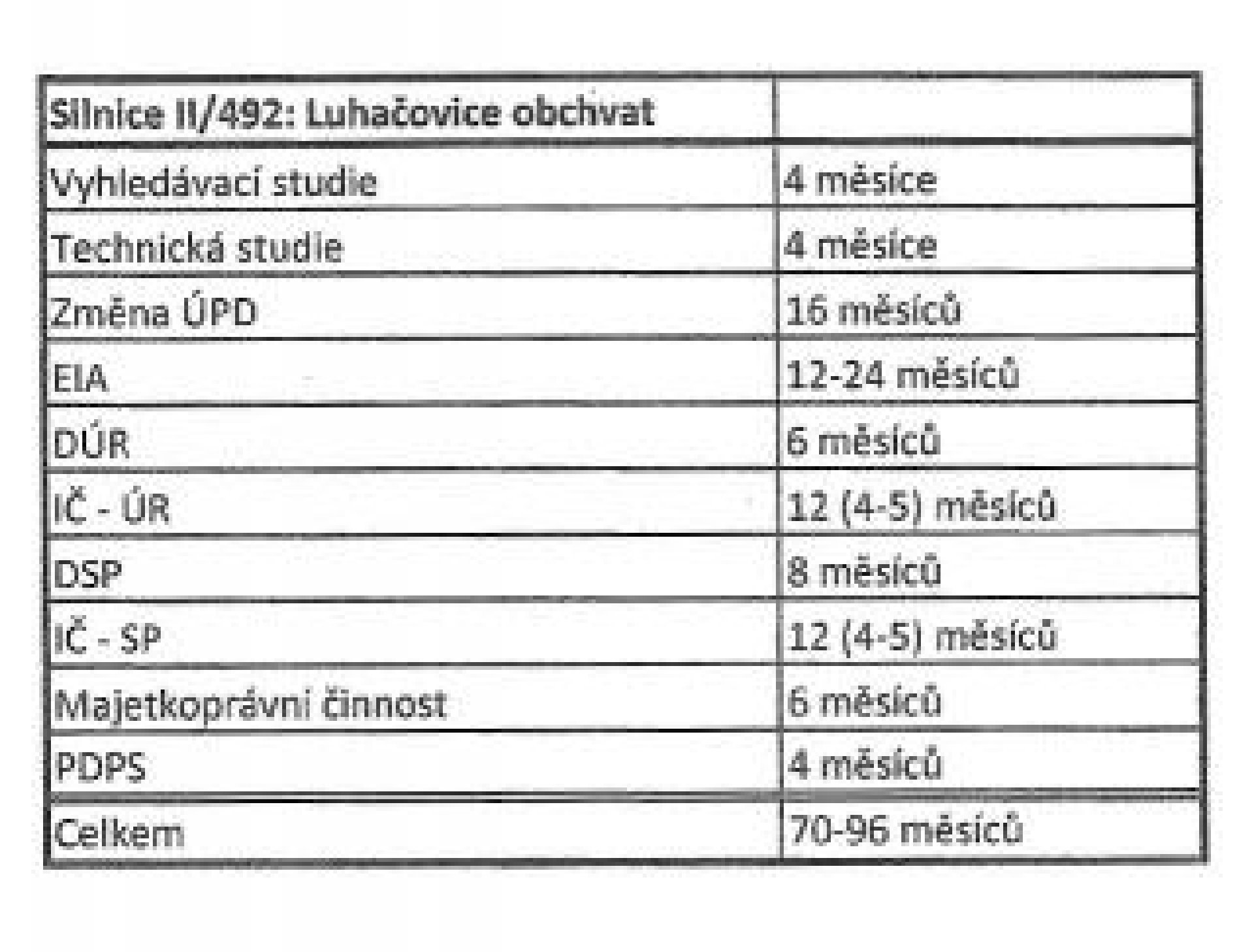 Tabulka činností nutných k přípravě stavbyInformace o průjezdu vozidel (převzato z níže uvedeného zdroje).Data lze najít na interaktivní mapě zveřejněné Ředitelstvím silnic a dálnic ČR. Jsou zde zaneseny výsledky z Celostátního sčítaní dopravy za roky 2010 a 2016.(Interaktivní mapa je dostupná na http://scitani2016.rsd.cz/pages/map/default.aspx ) Z porovnání údajů z let 2016 a 2010 lze také vyčíst, že počet těžkých vozidel projíždějících centrem Luhačovic se za 6 let zvedl o 100 denně)FOTOGALERIE: LUHAČOVICEMI PROJÍŽDĚJÍ DENNĚ TISÍCE KAMIONŮ