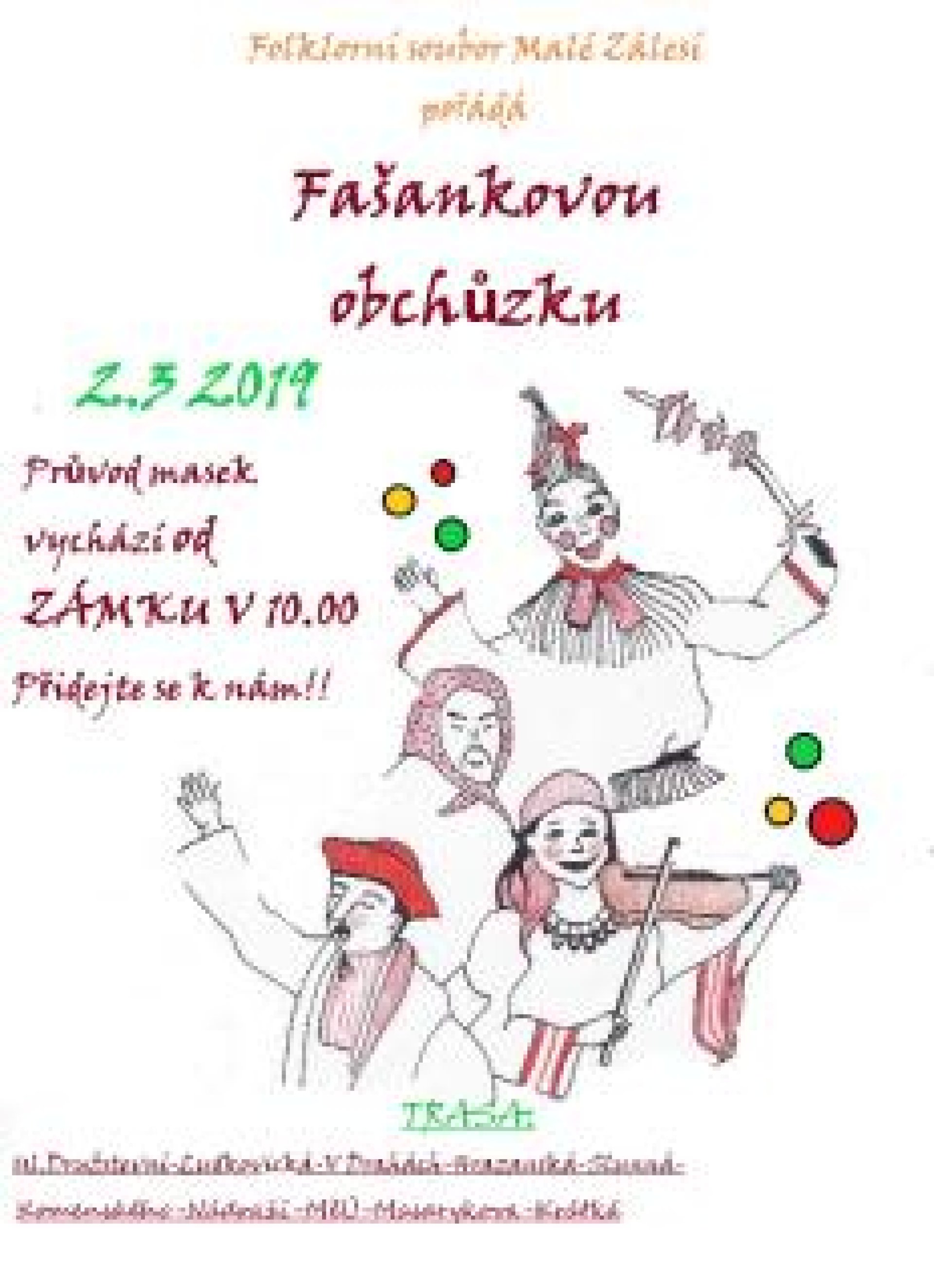 V sobotu 2. března v 10 dopoledne vyrazí od zámku fašankový průvod masek pořádaný souborem Malé Zálesí. Trasa, kudy bude směřovat veselý rej masek, je již tradiční. Za zpěvu a veselého dovádění masek půjde průvod, ve kterém nebude chybět ani medvěd, přes ulici Družstevní, Ludkovickou, Hrazanskou, Slunnou, Nádražní, Masarykovu a Krátkou. Cestou průvod čeká asi desítka domluvených zastavení, kde medvěd vyzve k tanci "paňmámu", ta za odměnu průvod pohostí.