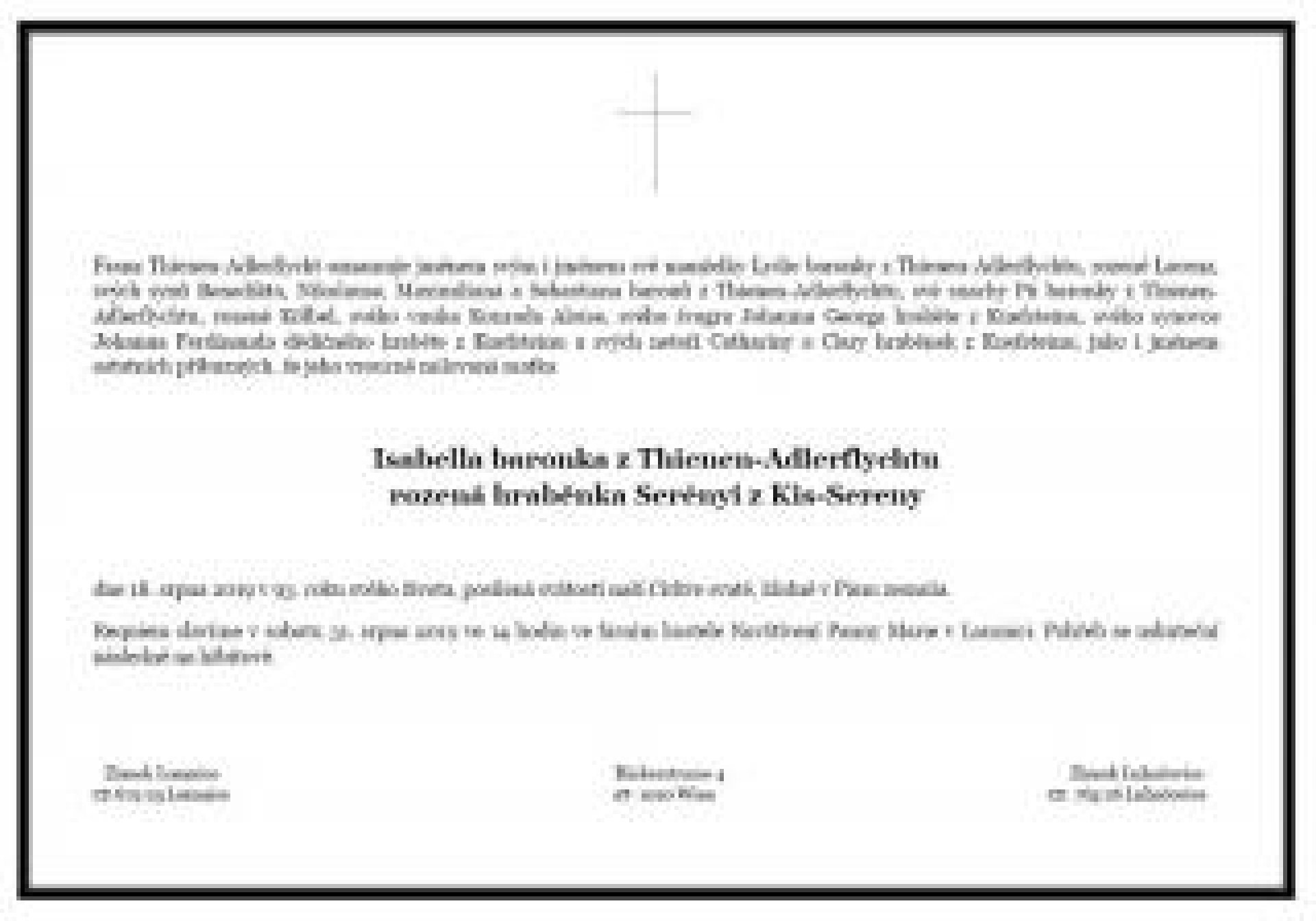 Zemřela Isabella baronka Thienen-Adlerflycht rozená hraběnka Serényiová. Její úmrtí oznámila rodina.