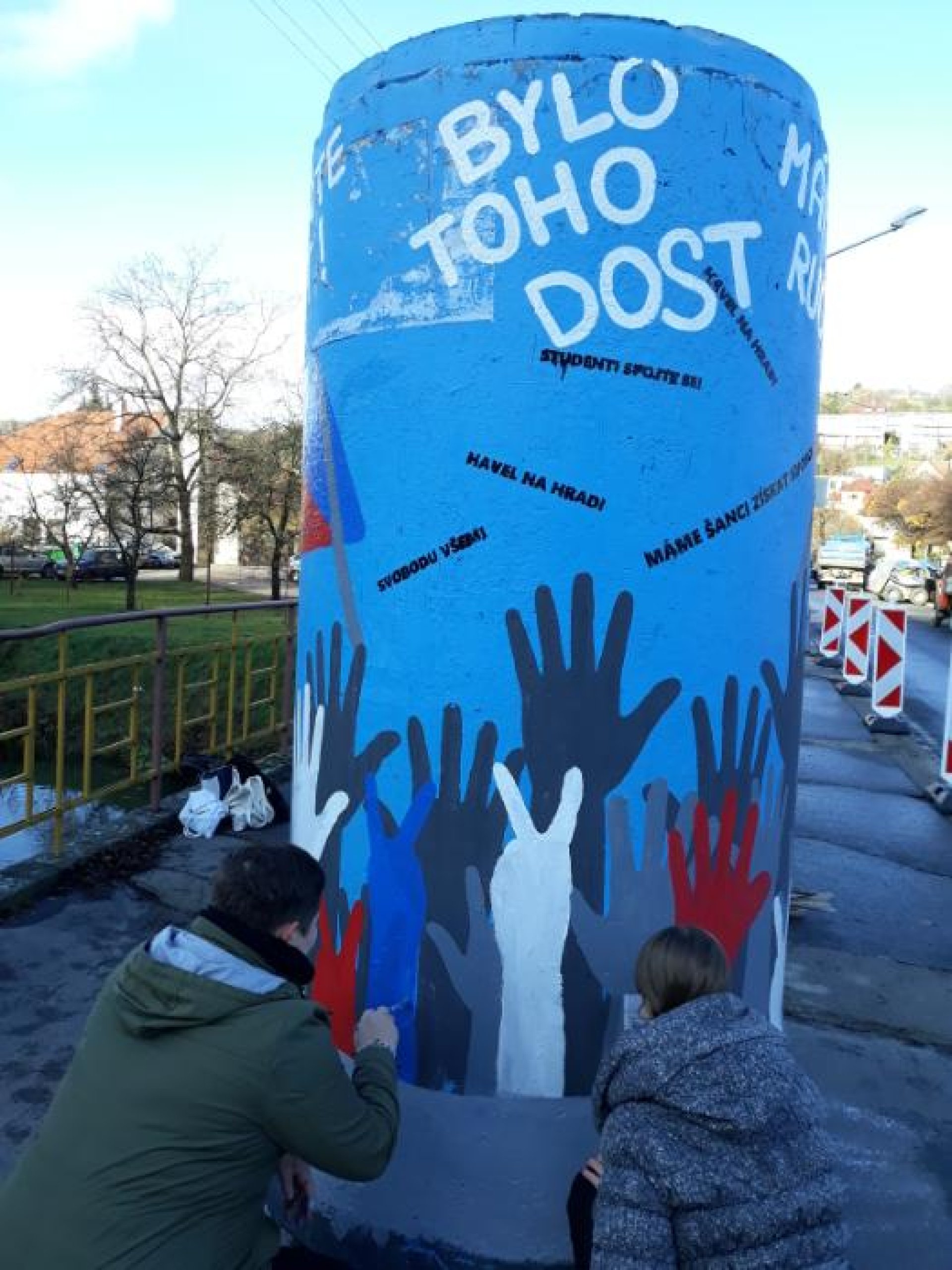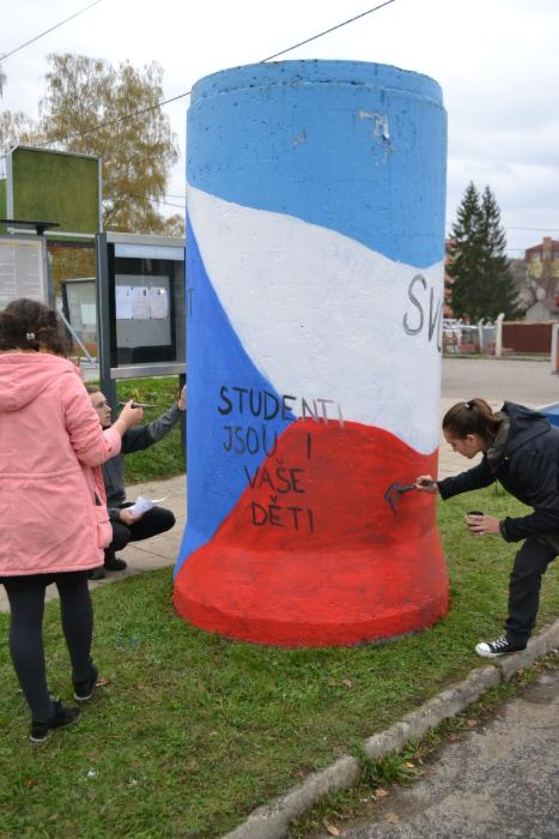 Názor pedagoga přidává akademický sochař a učitel na SOŠ Luhačovice Jiří Váp. „Přišlo nám velmi vhodné, aby se studenti podíleli na takovéto výzdobě města k výročí sametové revoluce. Nejenže tu mladí lidé pomalovávali sloupy, předtím v průběhu výuky a výtvarné přípravy sami na internetu hledali hesla, která se používala v roce 1989 při demonstracích tehdejšími studenty, poznamenal Váp. Prozradil také, že v roce 1989 byl sám právě ještě jako student přímým účastníkem revolučních změn. „Já měl vůbec takovou hektickou dobu, protože jsem v tom roce končil vysokou školu a také se mi narodil syn, přitom přišla revoluce, do které jsme se jako studenti zapojili. Na Karlovarsku jsme jezdili do továren upozorňovat na to, co se stalo 17. listopadu v Praze. Ta setkání byla docela dobrodružná. Bylo to velmi zajímavé, protože nikdo mimo Prahu příliš nevěděl co se děje. Když jsme se třeba ve Varech ve fabrice, kde jsme s kolegou dělali diplomovou práci, s místními pracovníky setkali, nikdo nám ty události nechtěl věřit a všichni se na nás dívali jako na blázny. Dokonce, když jsme o situaci vyprávěli, přistoupil k nám jeden starší pán a říkal: „Kluci rychle se sbalte, protože v Dalovicích jsou milicionáři, co tam střílí na terče. Ti určitě přijdou a zabijou vás,“ zavzpomínal Váp.