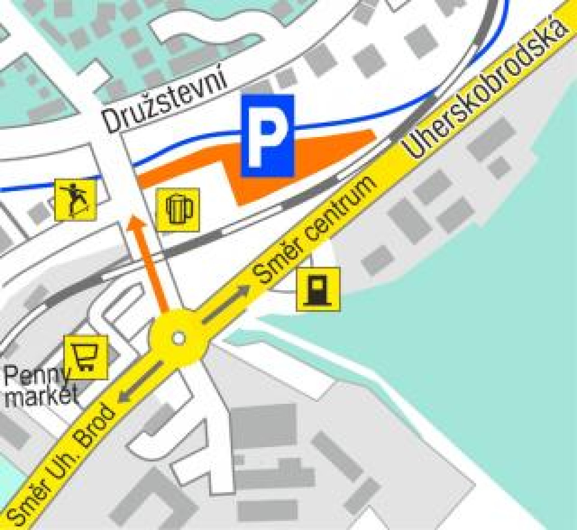 Odstavná plocha se nachází na příjezdu do města ve směru od Uherského Brodu. Na kruhovém objezdu u Penny marketu je nutné odbočit z hlavní silnice směrem k sídlišti. Vjezd na zpevněnou parkovací plochu se nachází po pravé straně mezi Restaurací MAT a mostem přes řeku. Na parkoviště bude řidiče navádět přechodné dopravní značení a také dobrovolní hasiči s asistencí Městské policie. Hasiči budou ze záchytného parkoviště odvážet návštěvníky mikrobusy do centra. Tam bude nástup a výstup pro kyvadlovou dopravu zřízen na malém parkovišti, které je přímo u luhačovické radnice.
