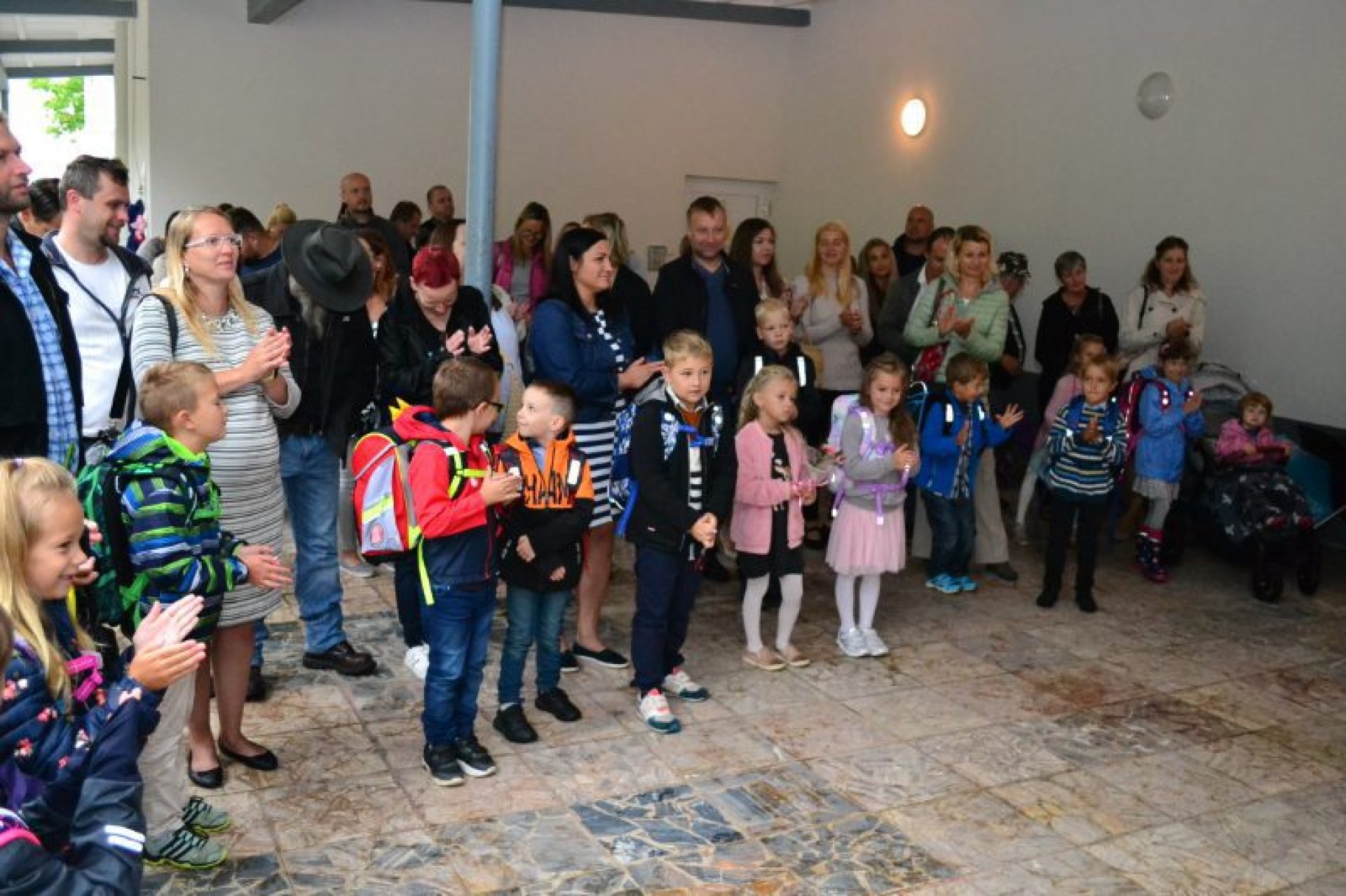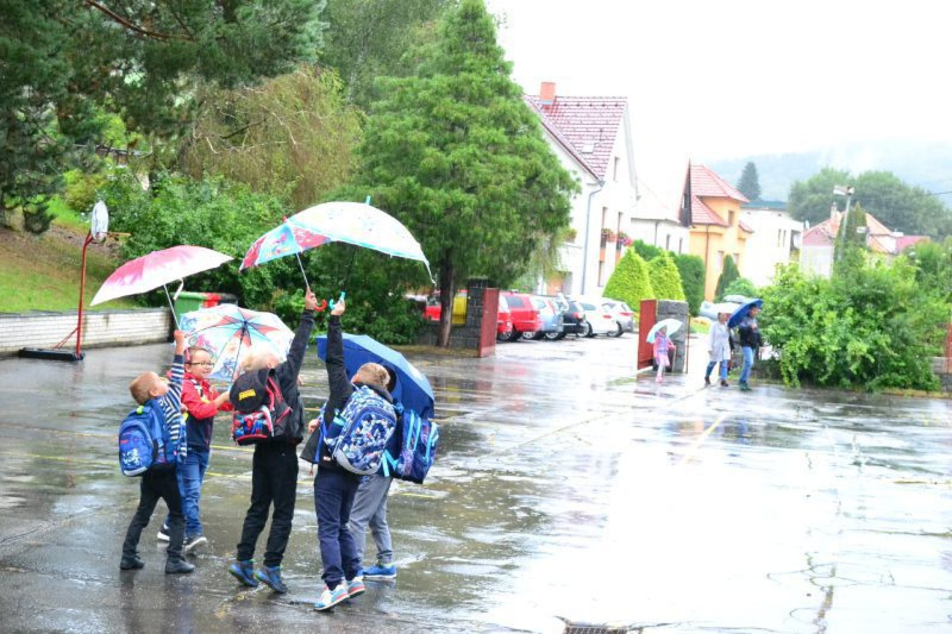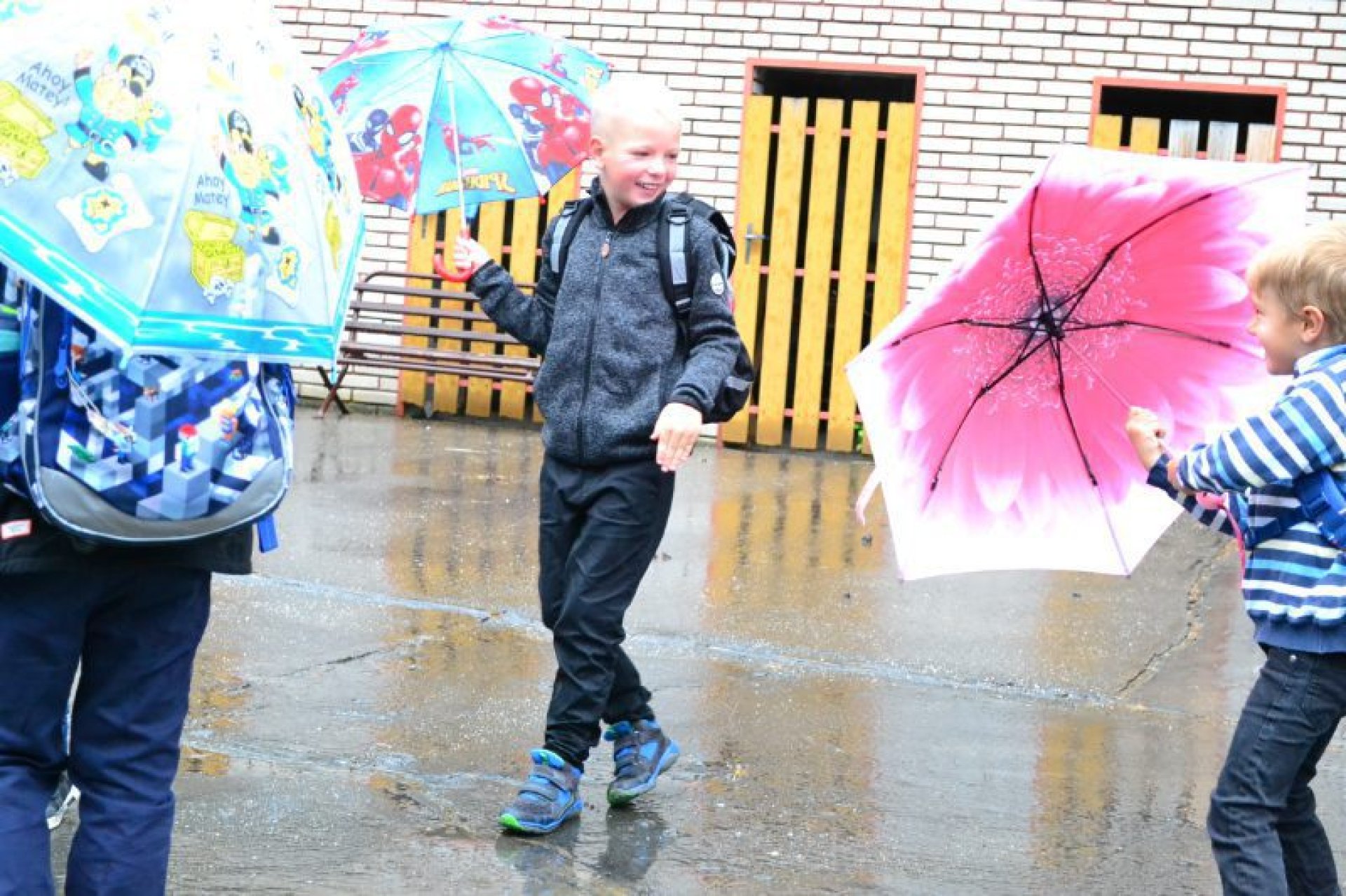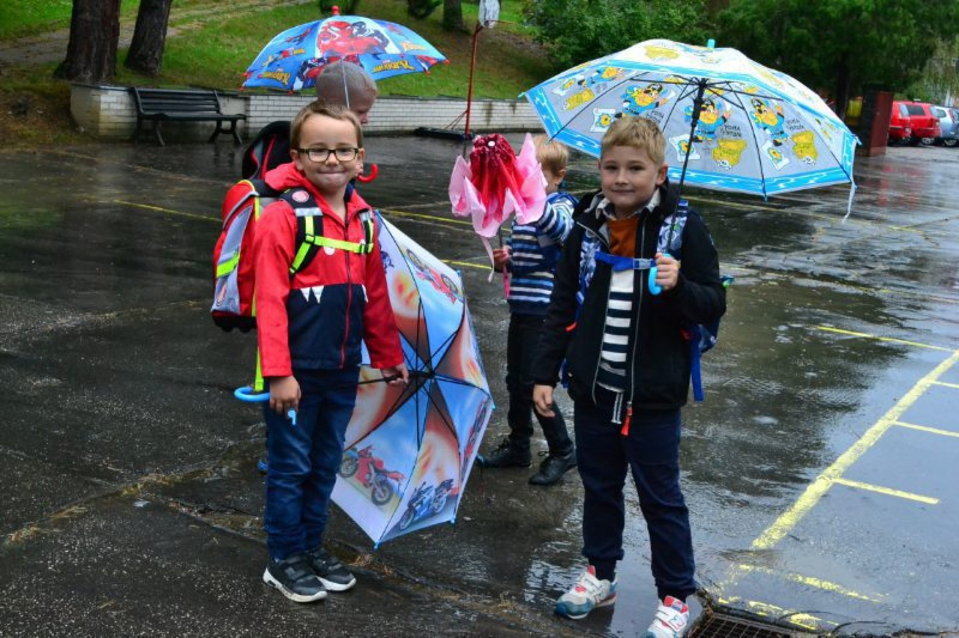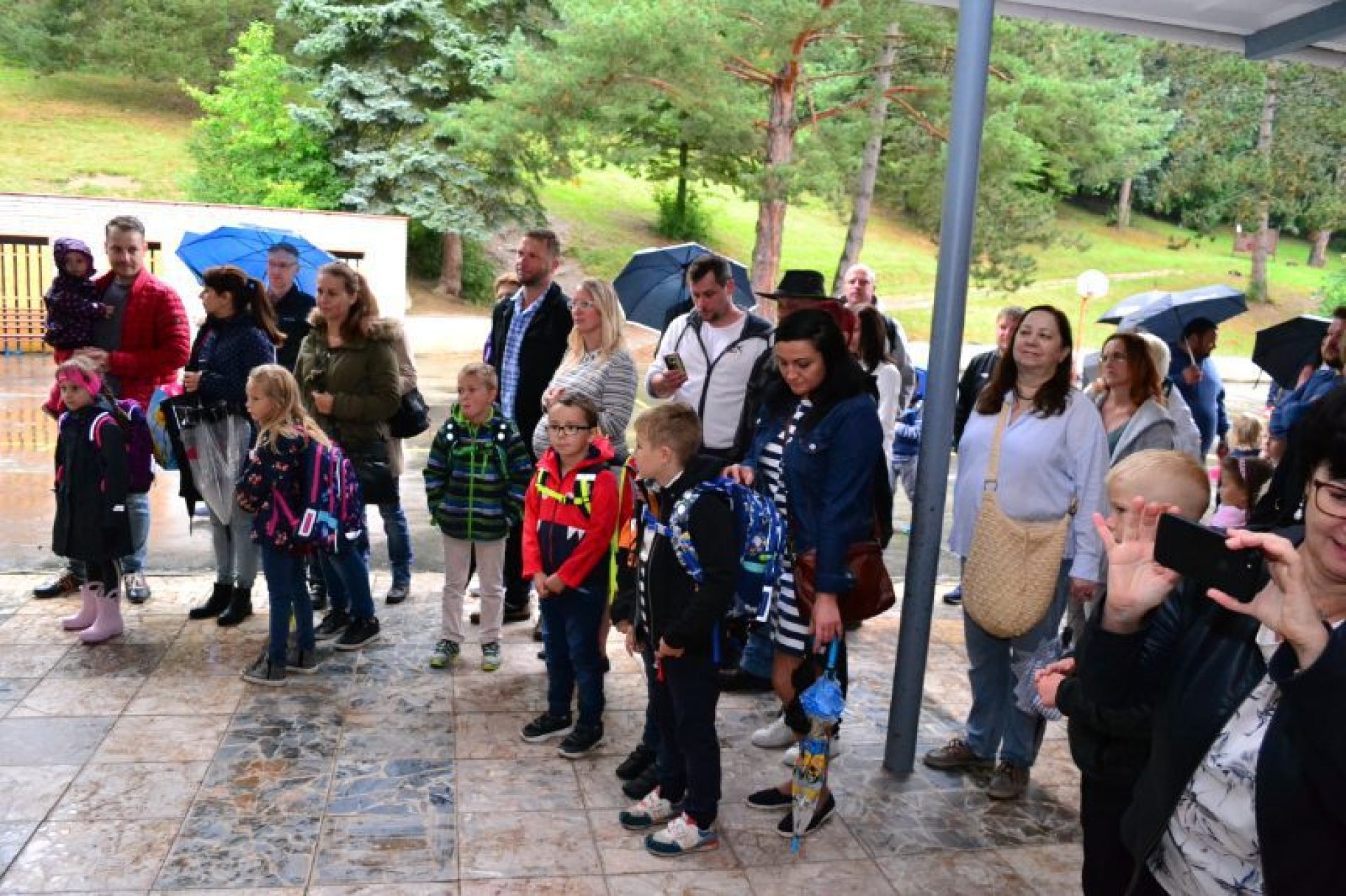 Příjemný začátek školy nepokazilo ani to, že ho provázelo deštivé ráno. Někteří kluci si tak aspoň mohli před začátkem setkání u školy zaskotačit s deštníky. Řada prvňáčků zamířila na svůj velký den už s aktovkou, většina s nadšením, jak to bývá někteří i s trochou obav, jak to zvládnou.
