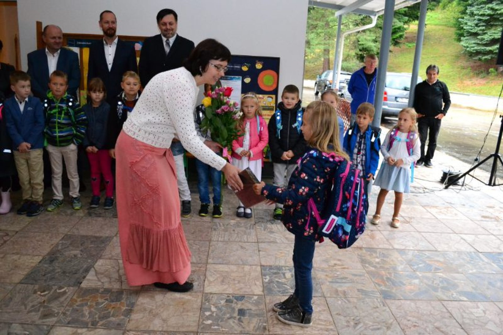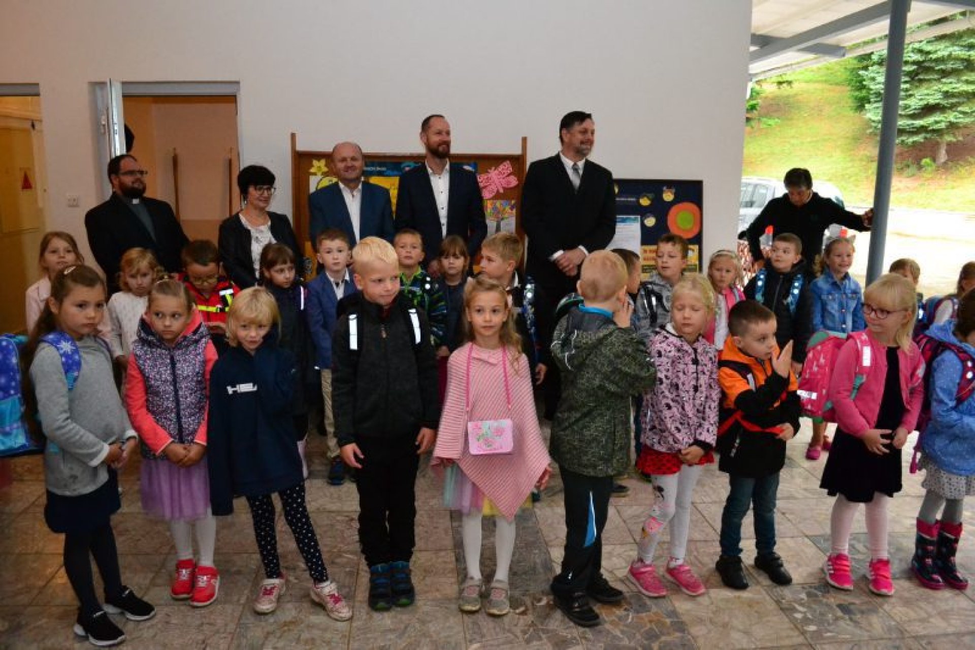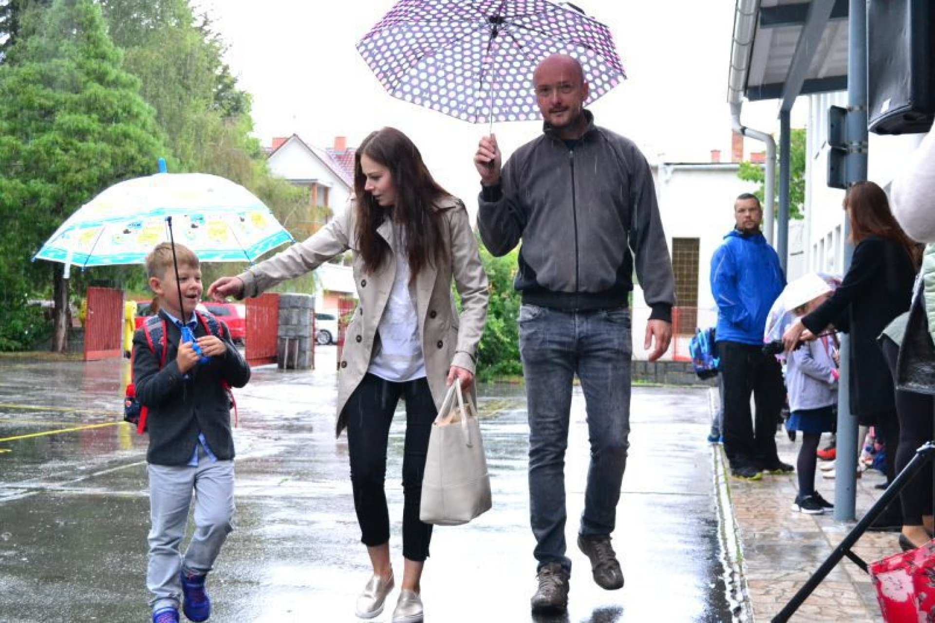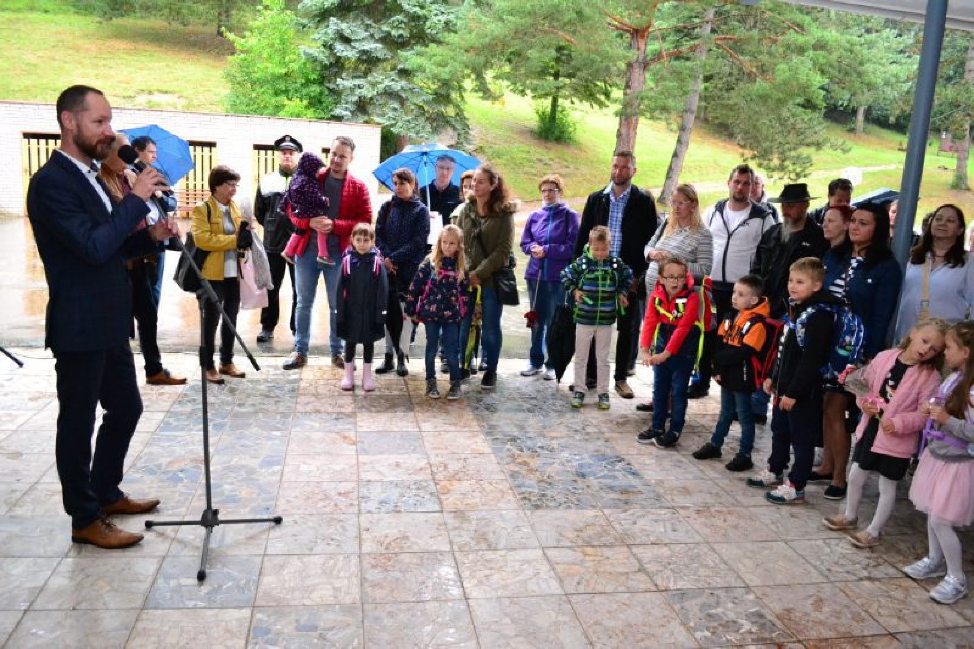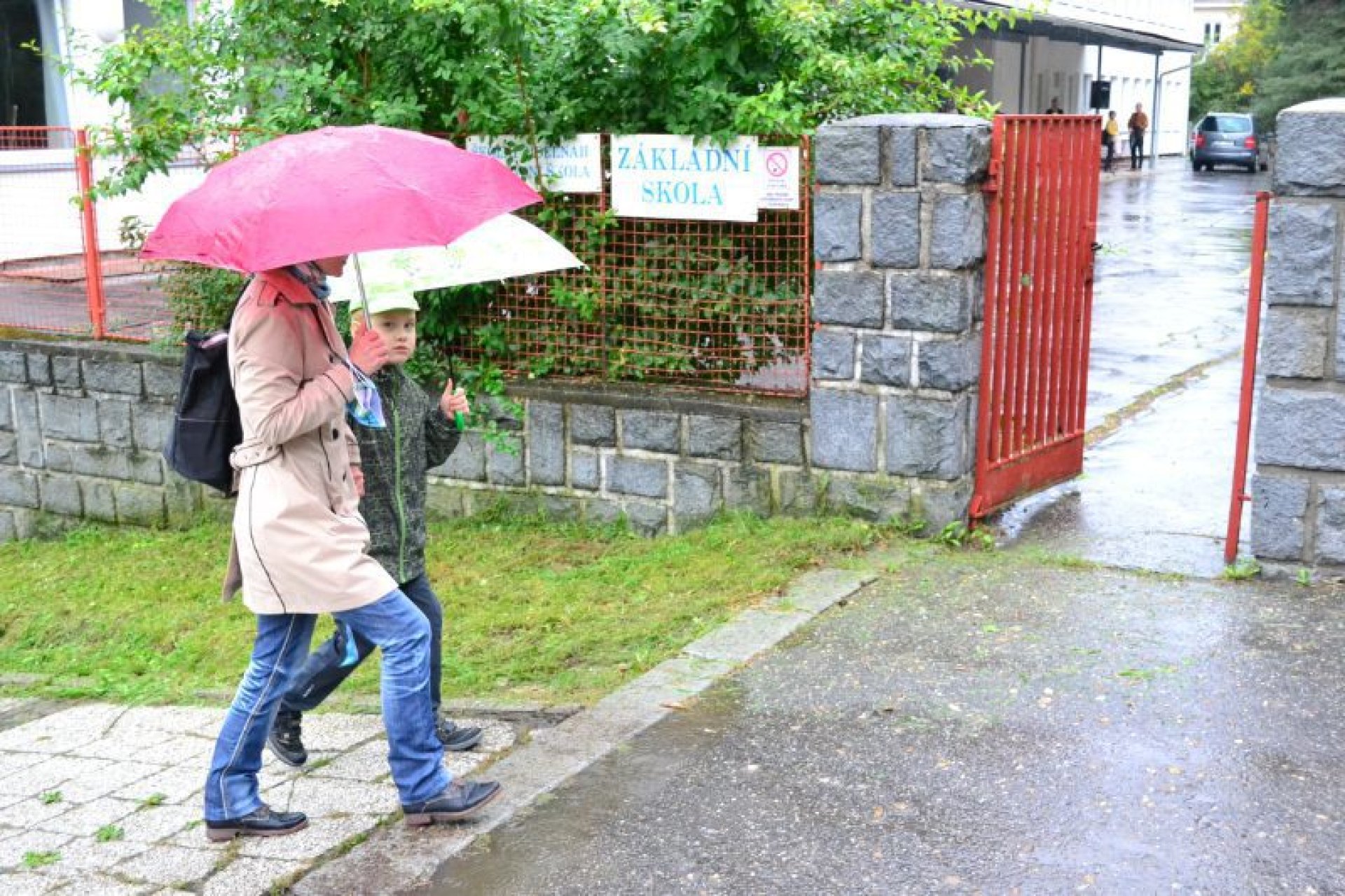 Příjemný začátek školy nepokazilo ani to, že ho provázelo deštivé ráno. Někteří kluci si tak aspoň mohli před začátkem setkání u školy zaskotačit s deštníky. Řada prvňáčků zamířila na svůj velký den už s aktovkou, většina s nadšením, jak to bývá někteří i s trochou obav, jak to zvládnou.