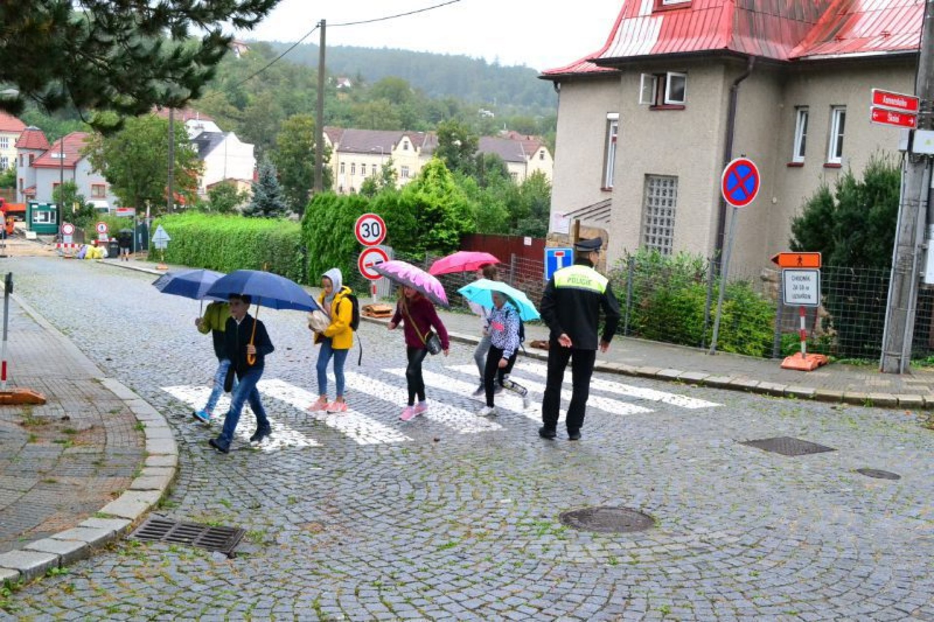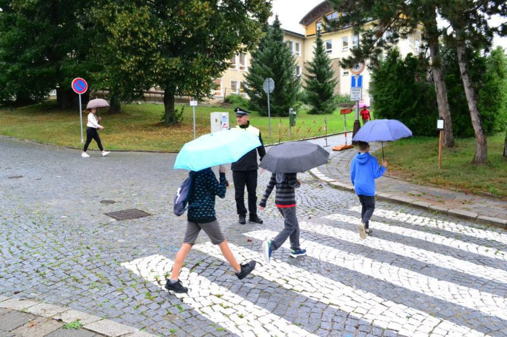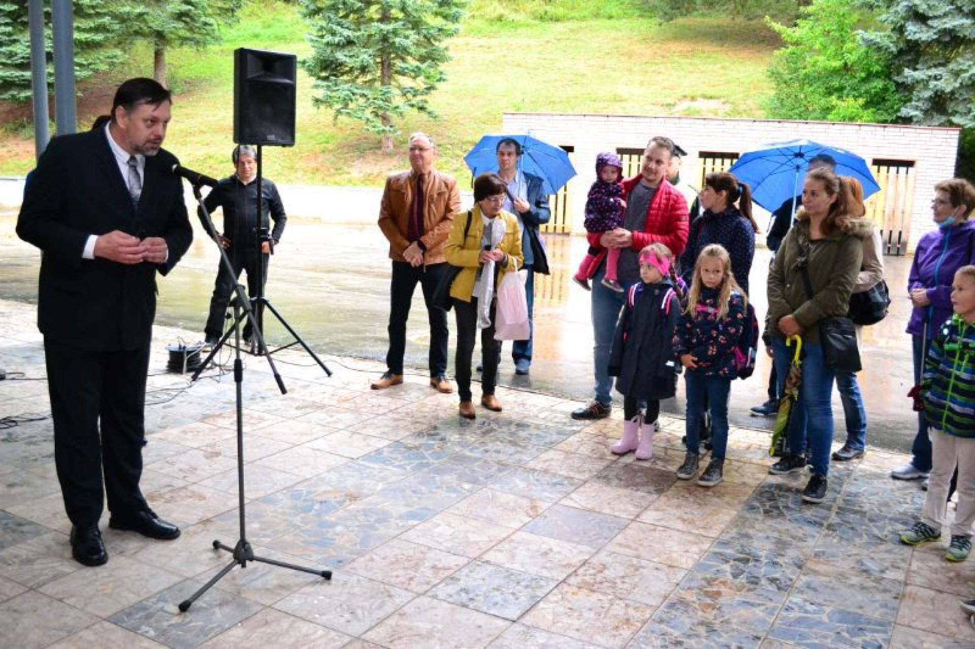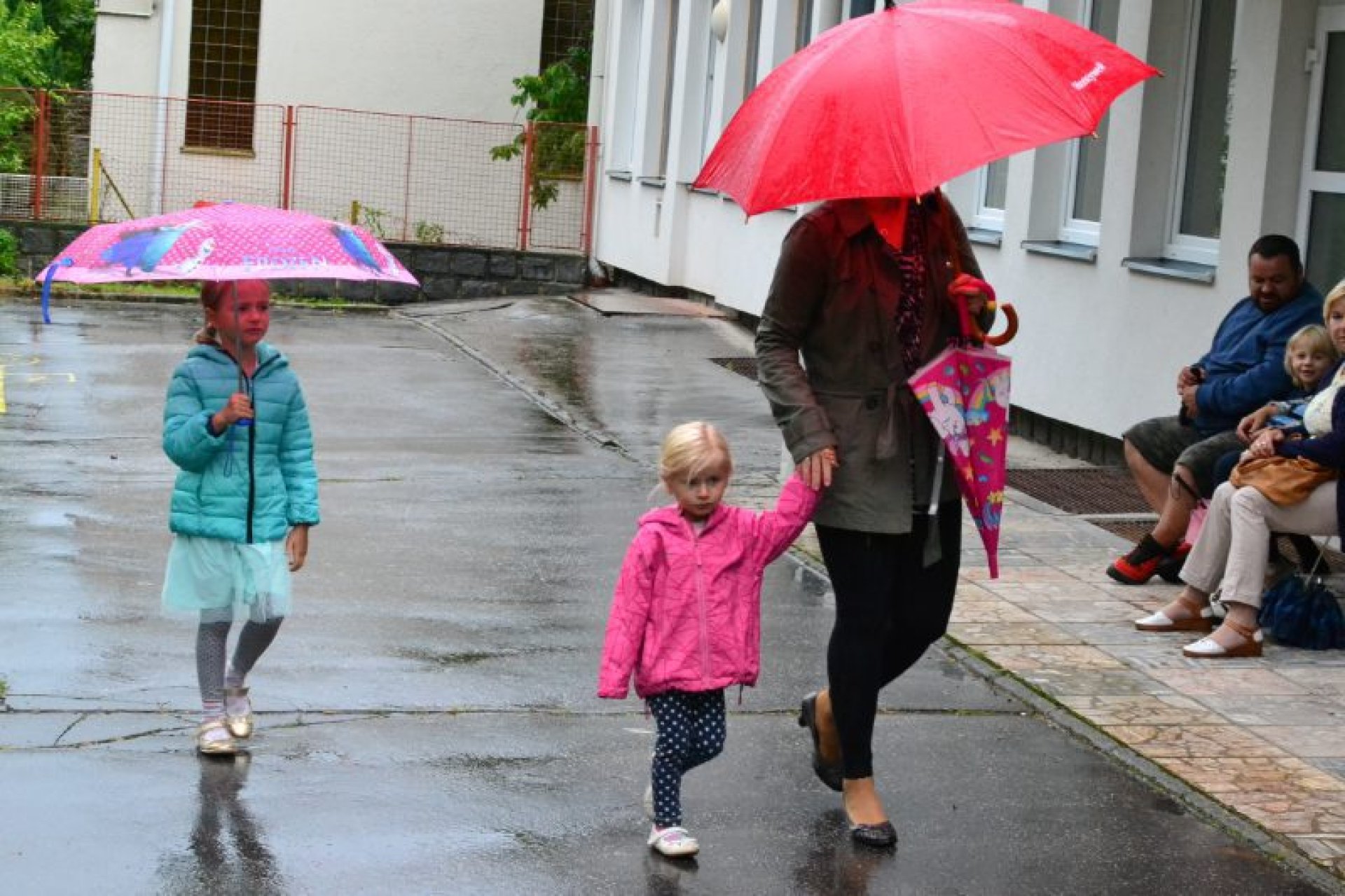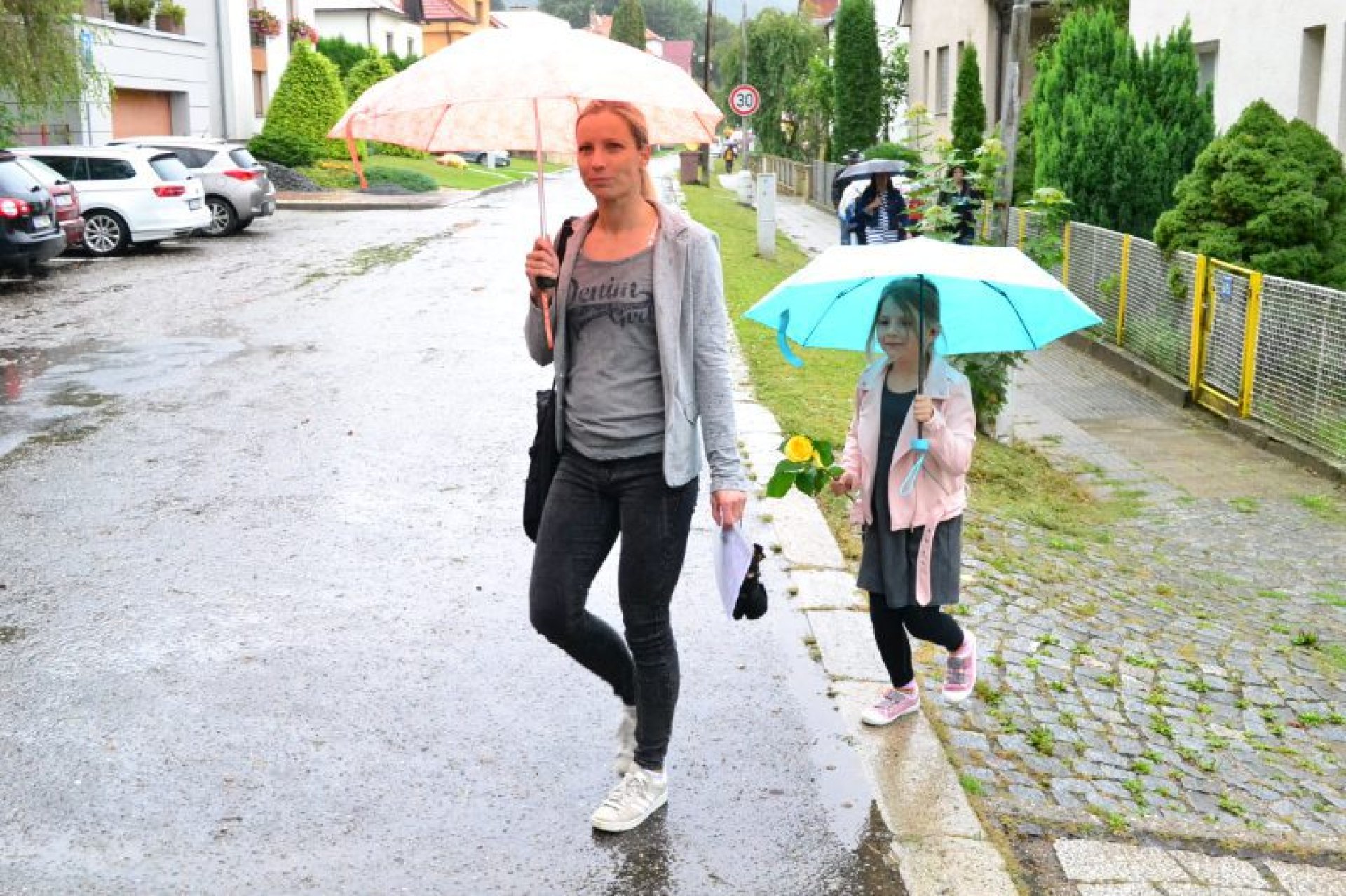 Příjemný začátek školy nepokazilo ani to, že ho provázelo deštivé ráno. Někteří kluci si tak aspoň mohli před začátkem setkání u školy zaskotačit s deštníky. Řada prvňáčků zamířila na svůj velký den už s aktovkou, většina s nadšením, jak to bývá někteří i s trochou obav, jak to zvládnou.