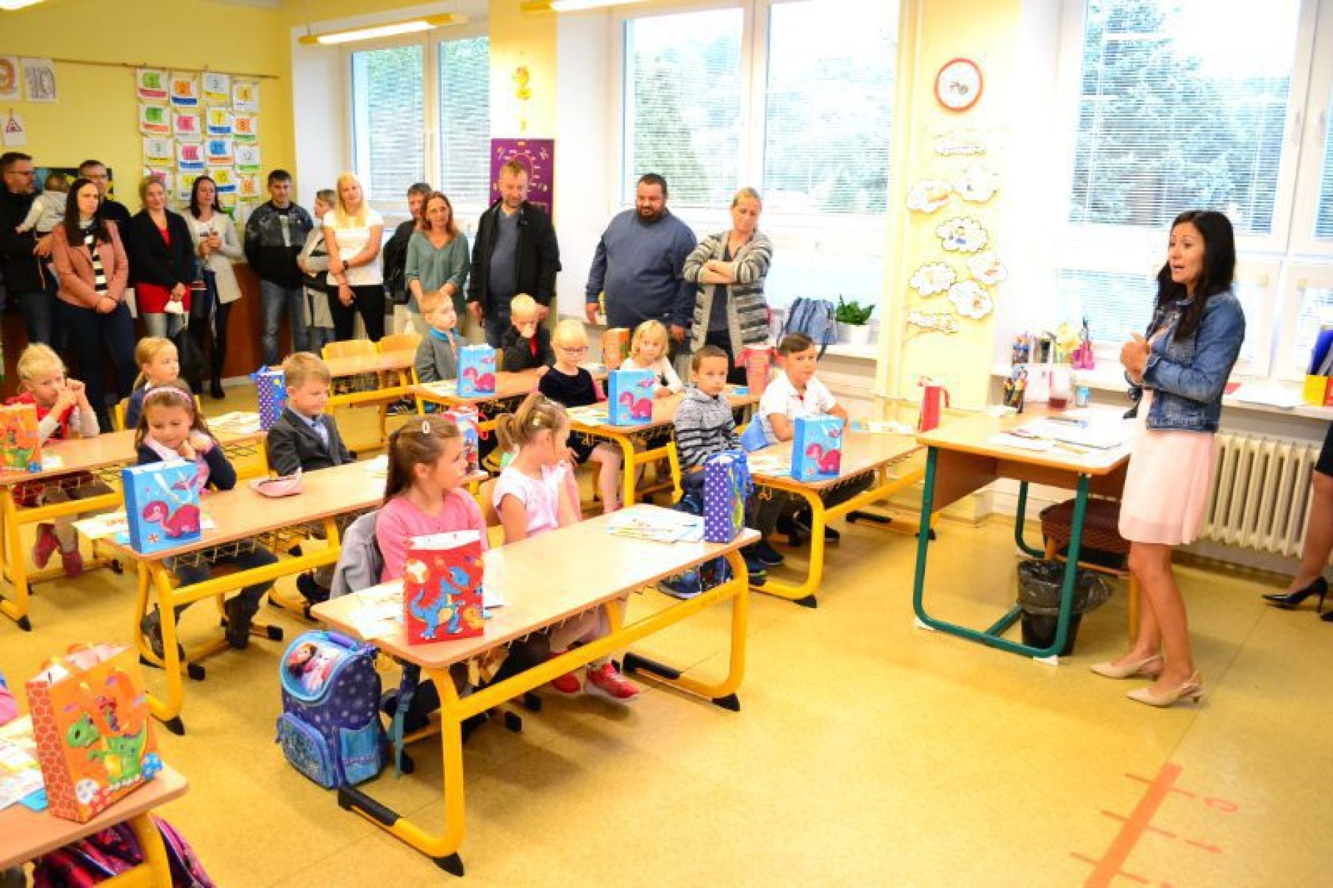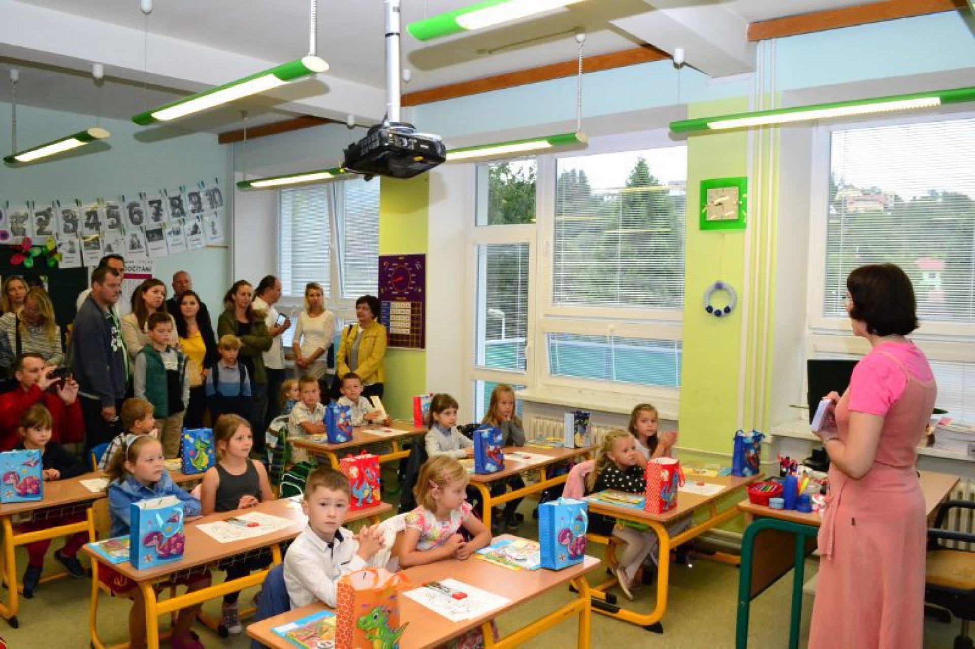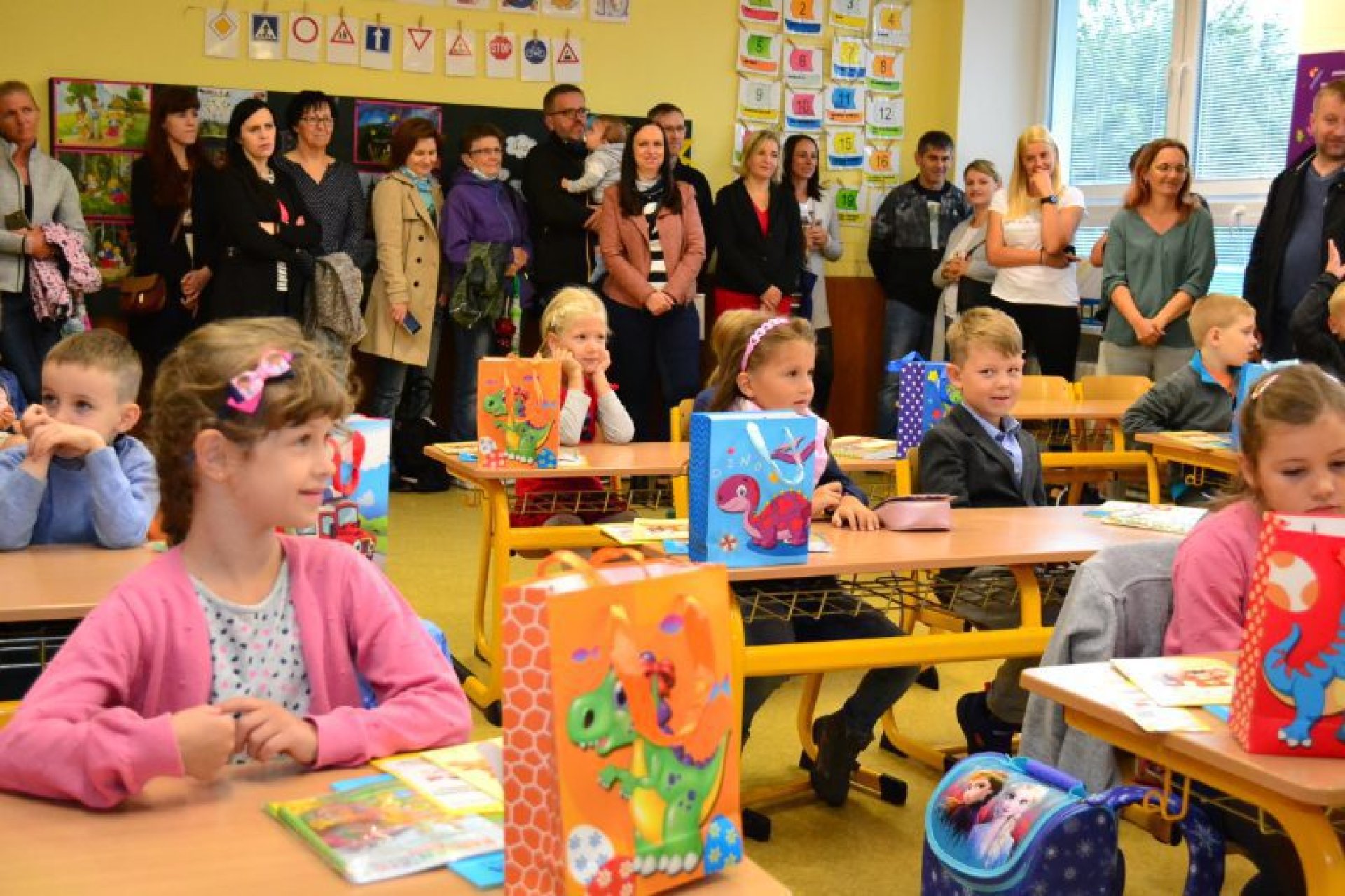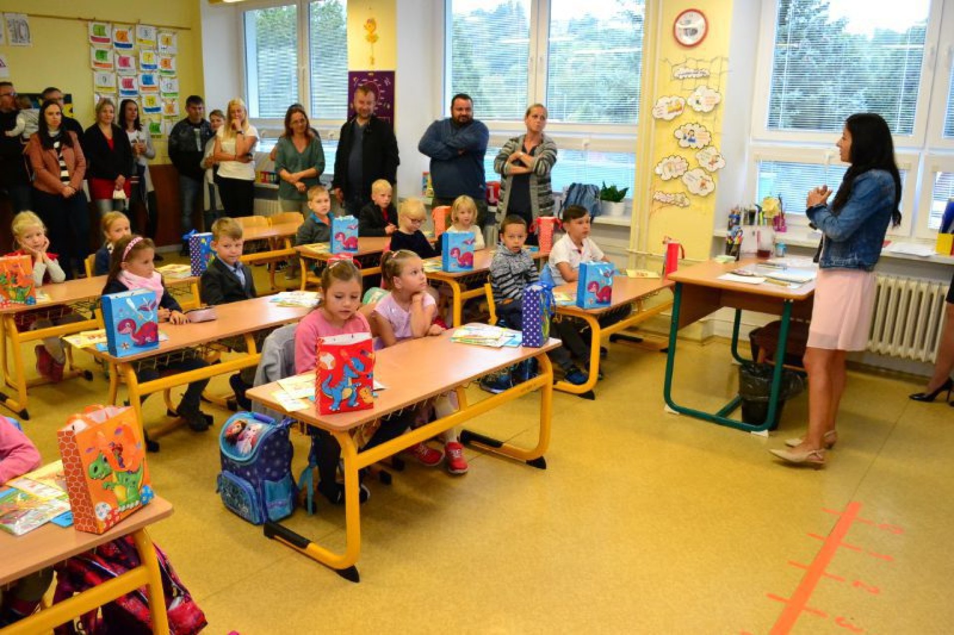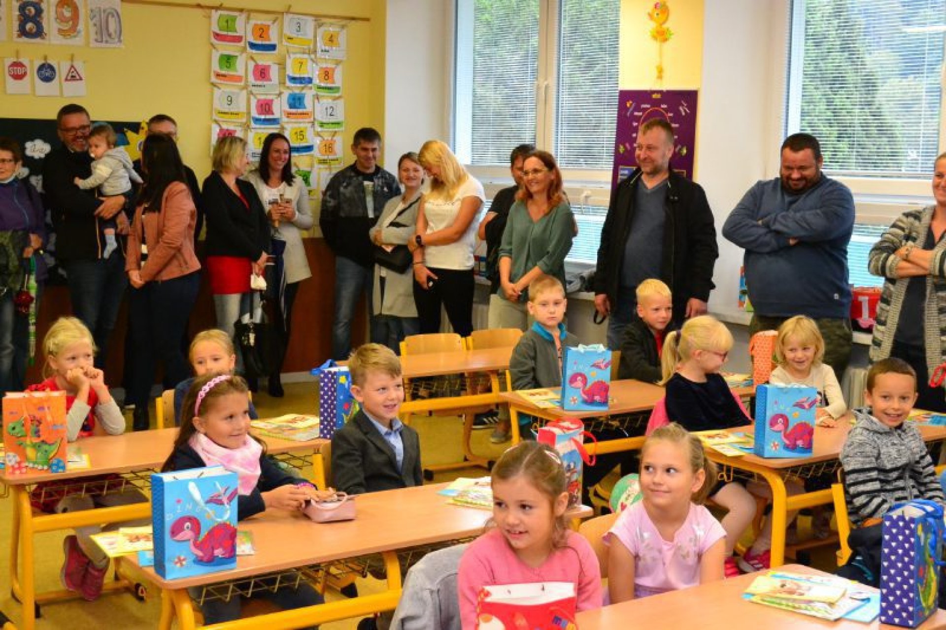 Po uvítání školáků a jejich rodičů byly jednotlivé děti rozřazeny do tříd a pozdravily se se svou třídní učitelkou. V řadě případů nechyběla od dětí na uvítanou pro paní učitelku květina nebo bonboniéra. Na ZŠ Luhačovice letos 1. A povede Mgr. Vendula Mrkvičková, 1.B Mgr. Dana Josefíková. Spolu s nimi zamířily děti do svých tříd, kam je následovali i rodiče. Pro kluky a holky byly připraveny první úkoly, jako najít své napsané jméno, ale i spousta dárků v podobě sešitů, psacích potřeb a dalších věcí. Na rodiče pak byla směřována řada důležitých informací o chodu školy, školní družiny a podobně. Rodiče prvňáků s trvalým bydlištěm ve městě také od radnice dostali finanční příspěvek na nákup školních pomůcek.