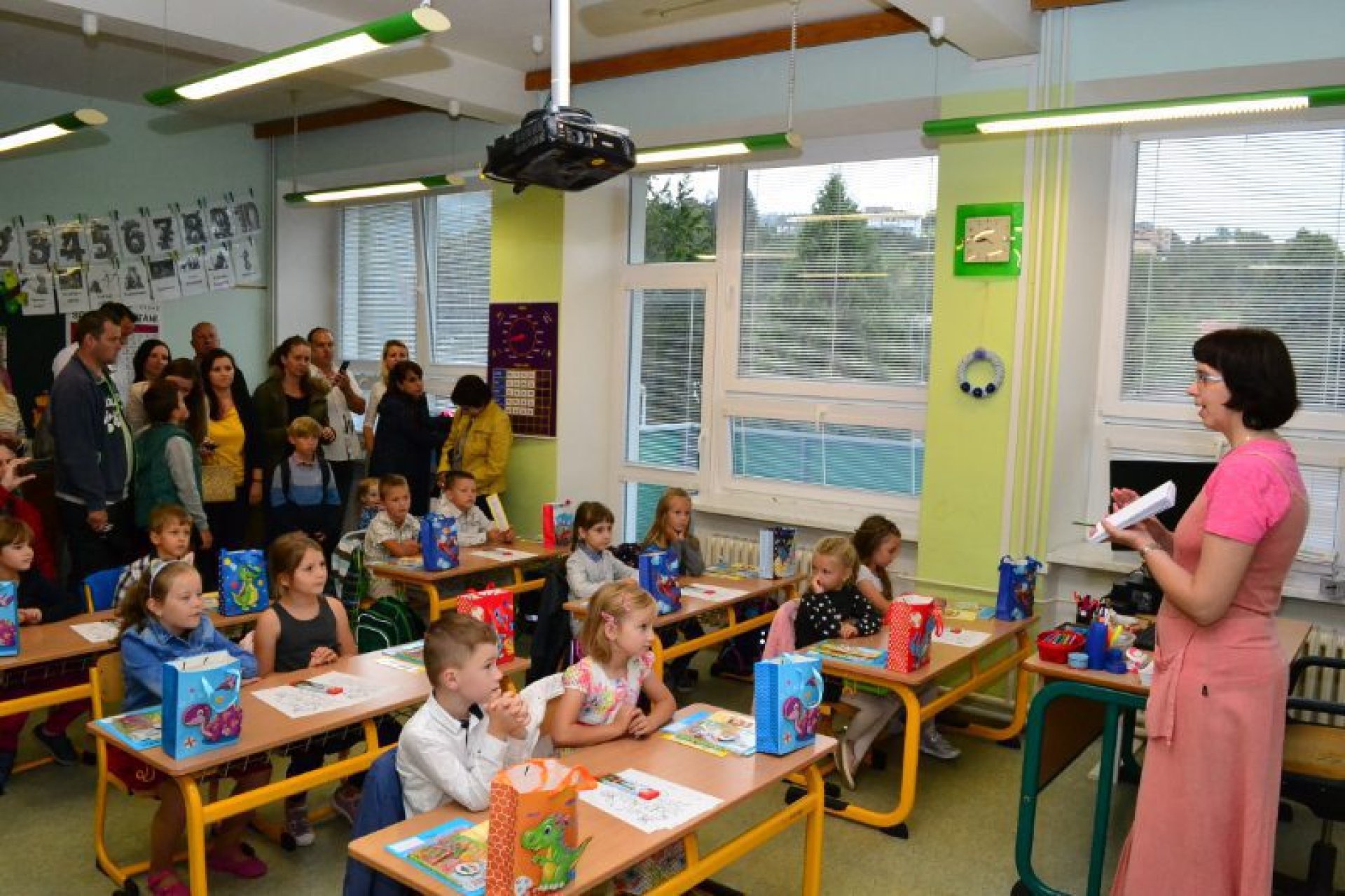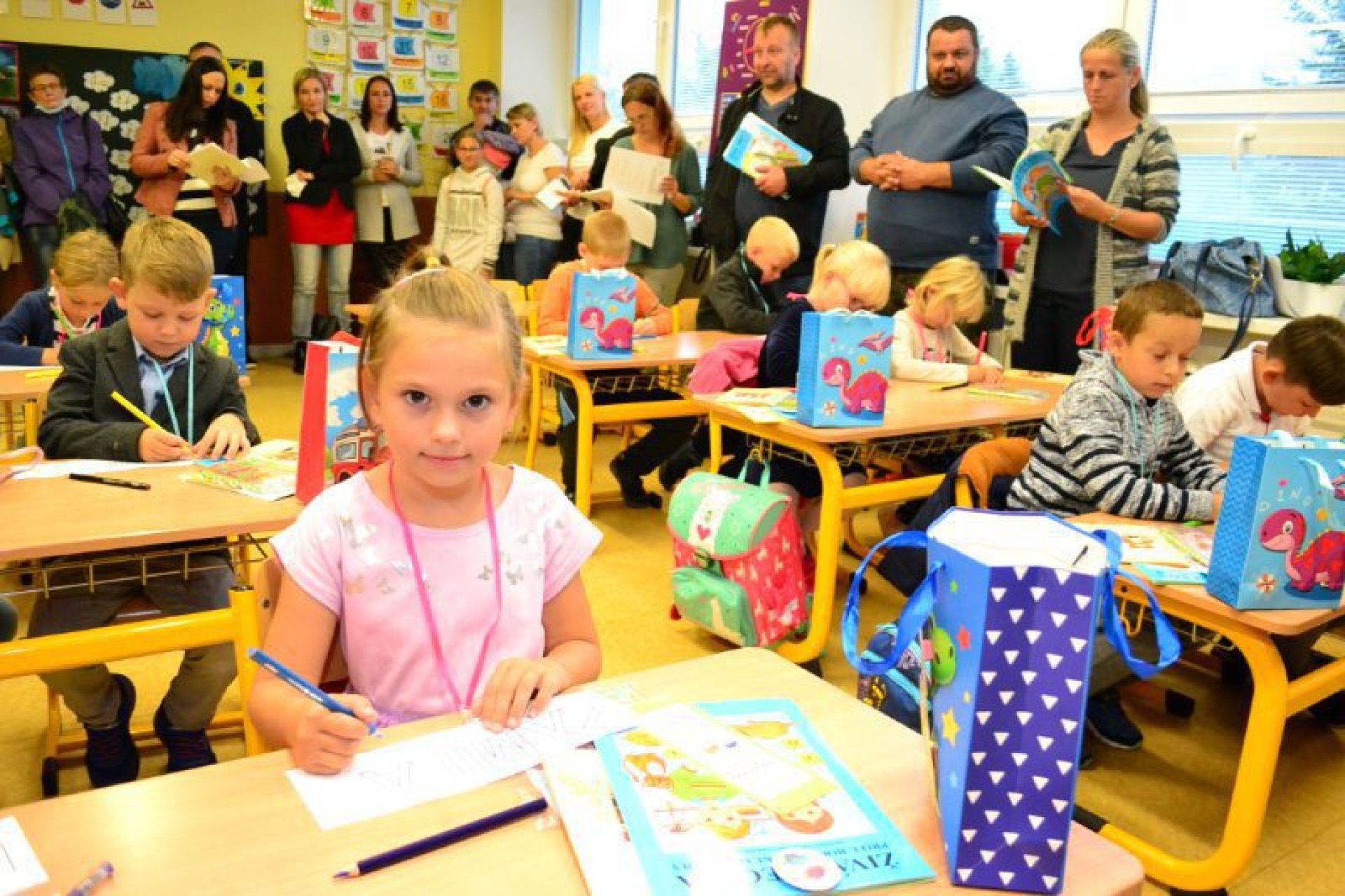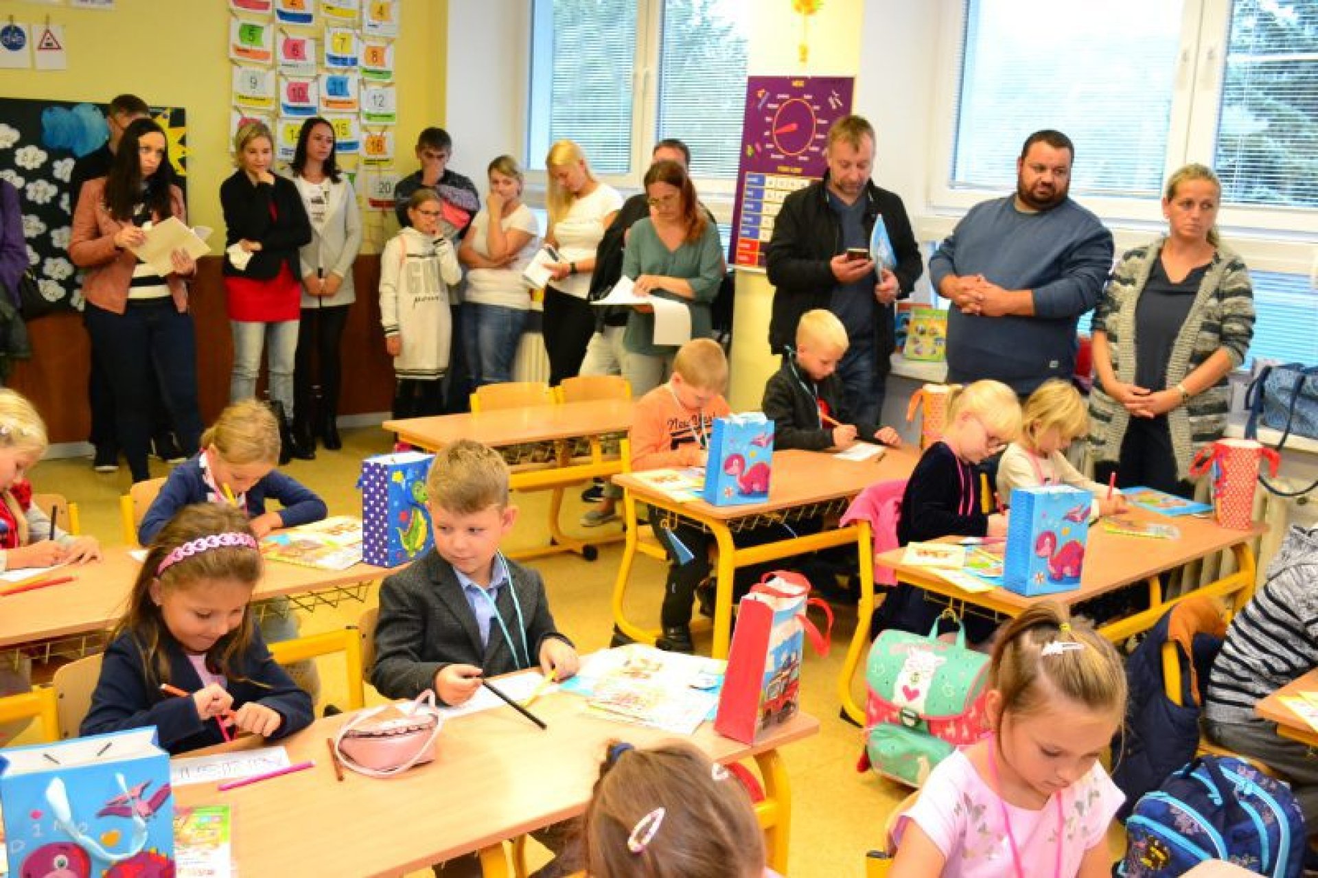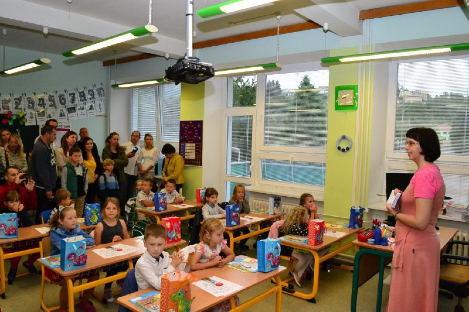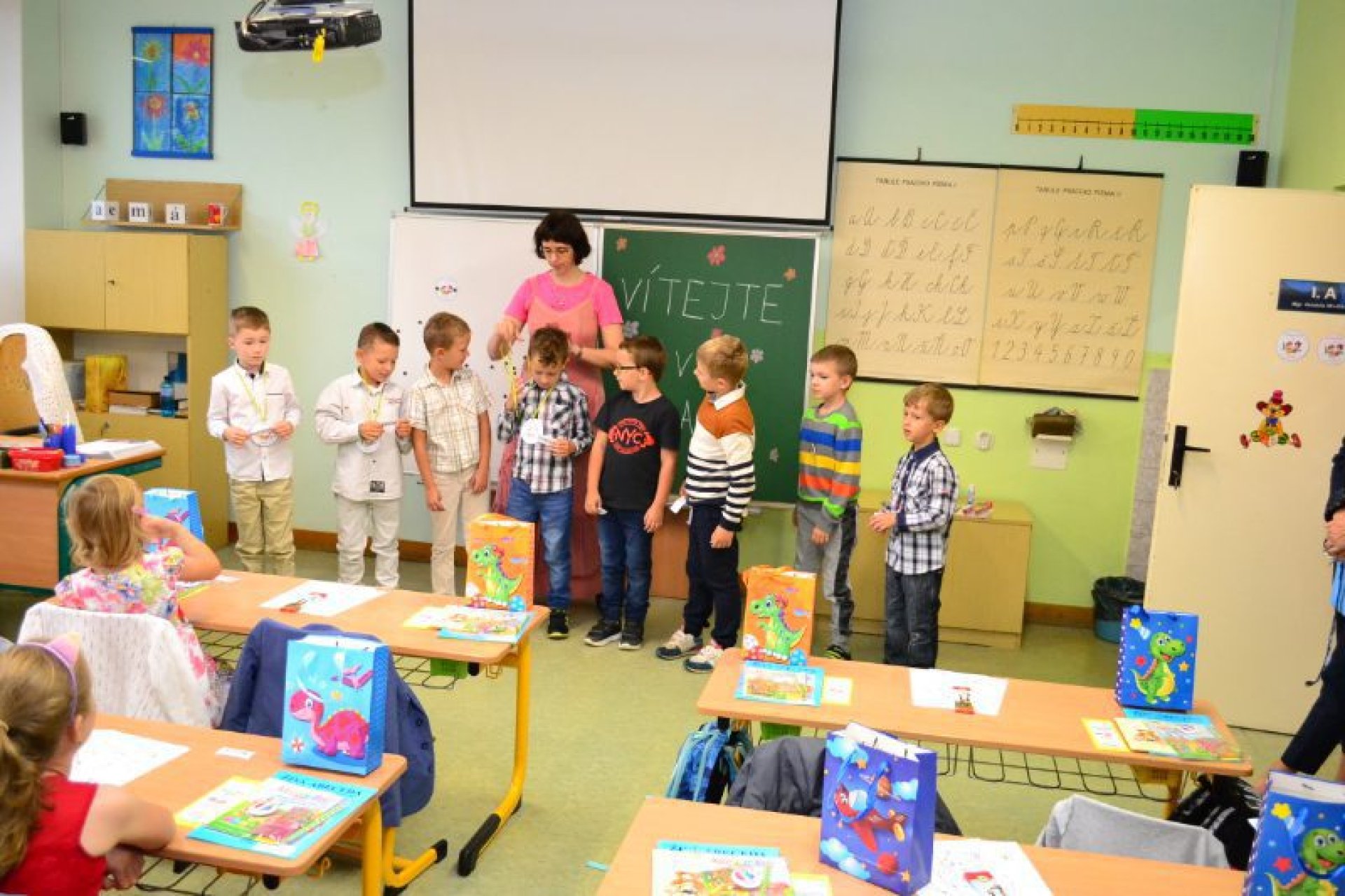 Po uvítání školáků a jejich rodičů byly jednotlivé děti rozřazeny do tříd a pozdravily se se svou třídní učitelkou. V řadě případů nechyběla od dětí na uvítanou pro paní učitelku květina nebo bonboniéra. Na ZŠ Luhačovice letos 1. A povede Mgr. Vendula Mrkvičková, 1.B Mgr. Dana Josefíková. Spolu s nimi zamířily děti do svých tříd, kam je následovali i rodiče. Pro kluky a holky byly připraveny první úkoly, jako najít své napsané jméno, ale i spousta dárků v podobě sešitů, psacích potřeb a dalších věcí. Na rodiče pak byla směřována řada důležitých informací o chodu školy, školní družiny a podobně. Rodiče prvňáků s trvalým bydlištěm ve městě také od radnice dostali finanční příspěvek na nákup školních pomůcek.