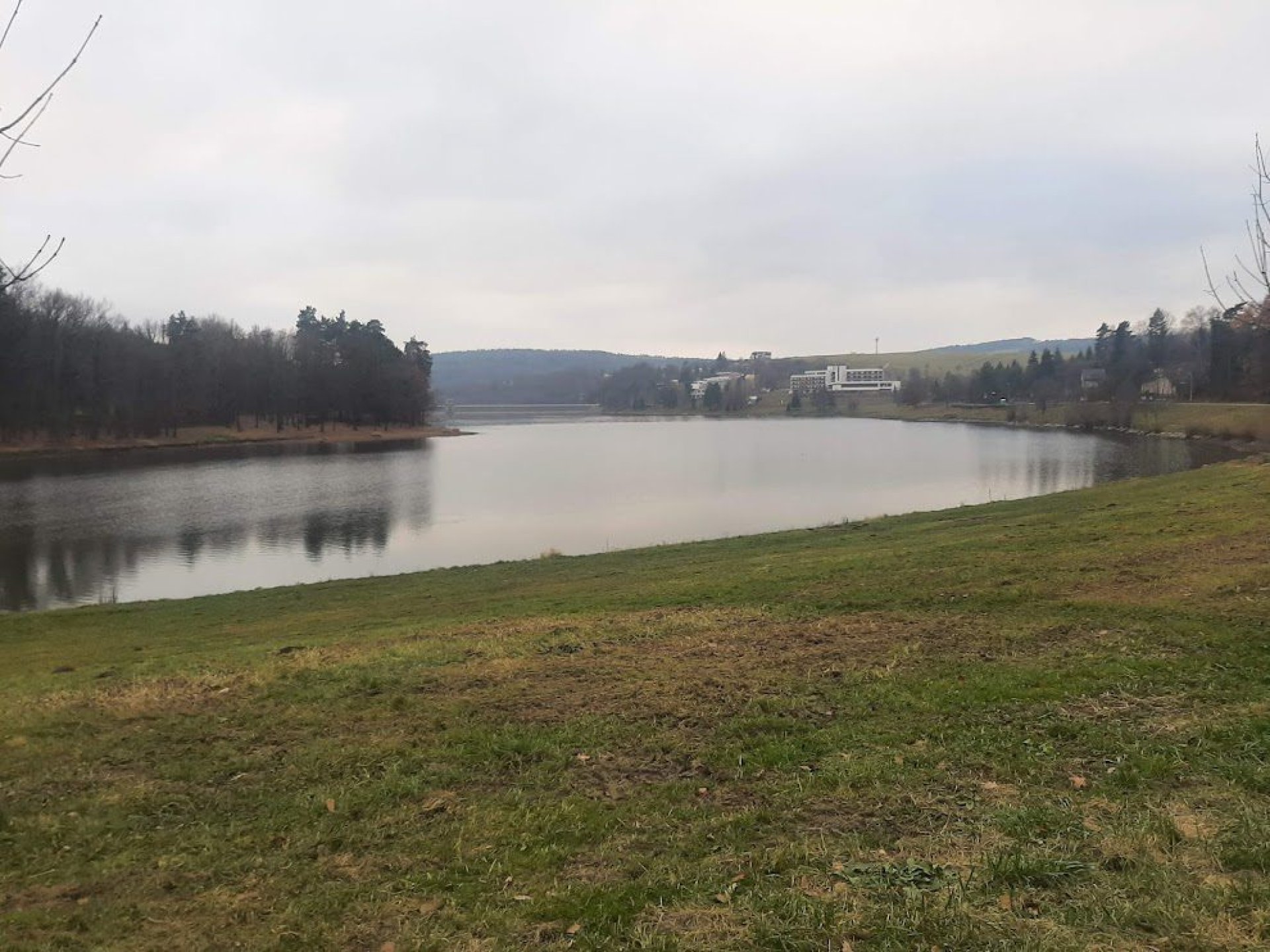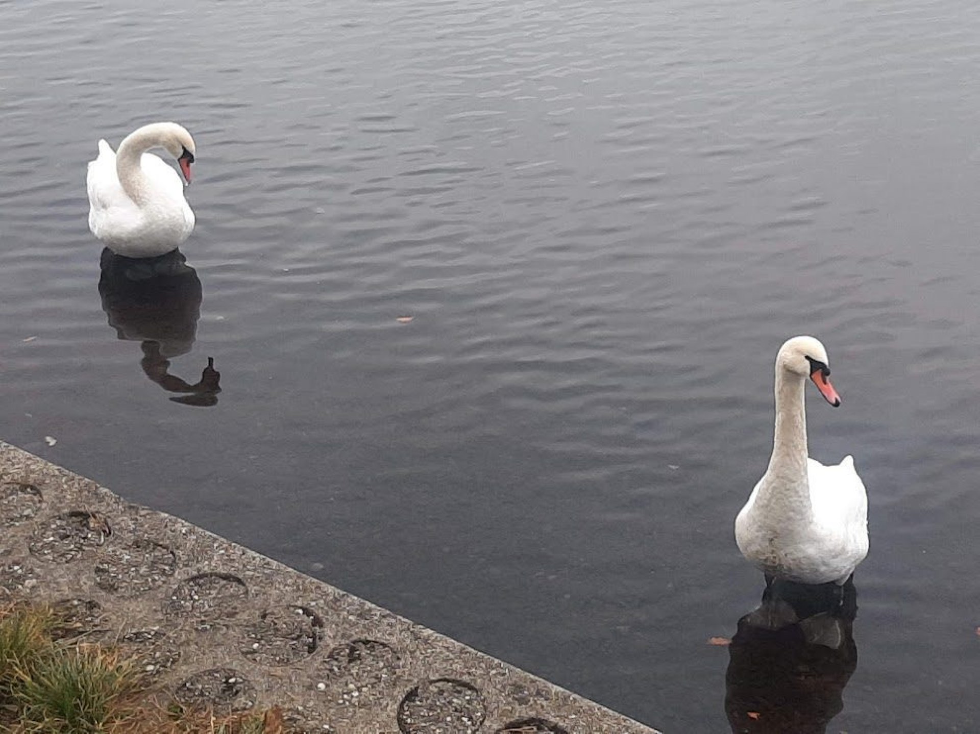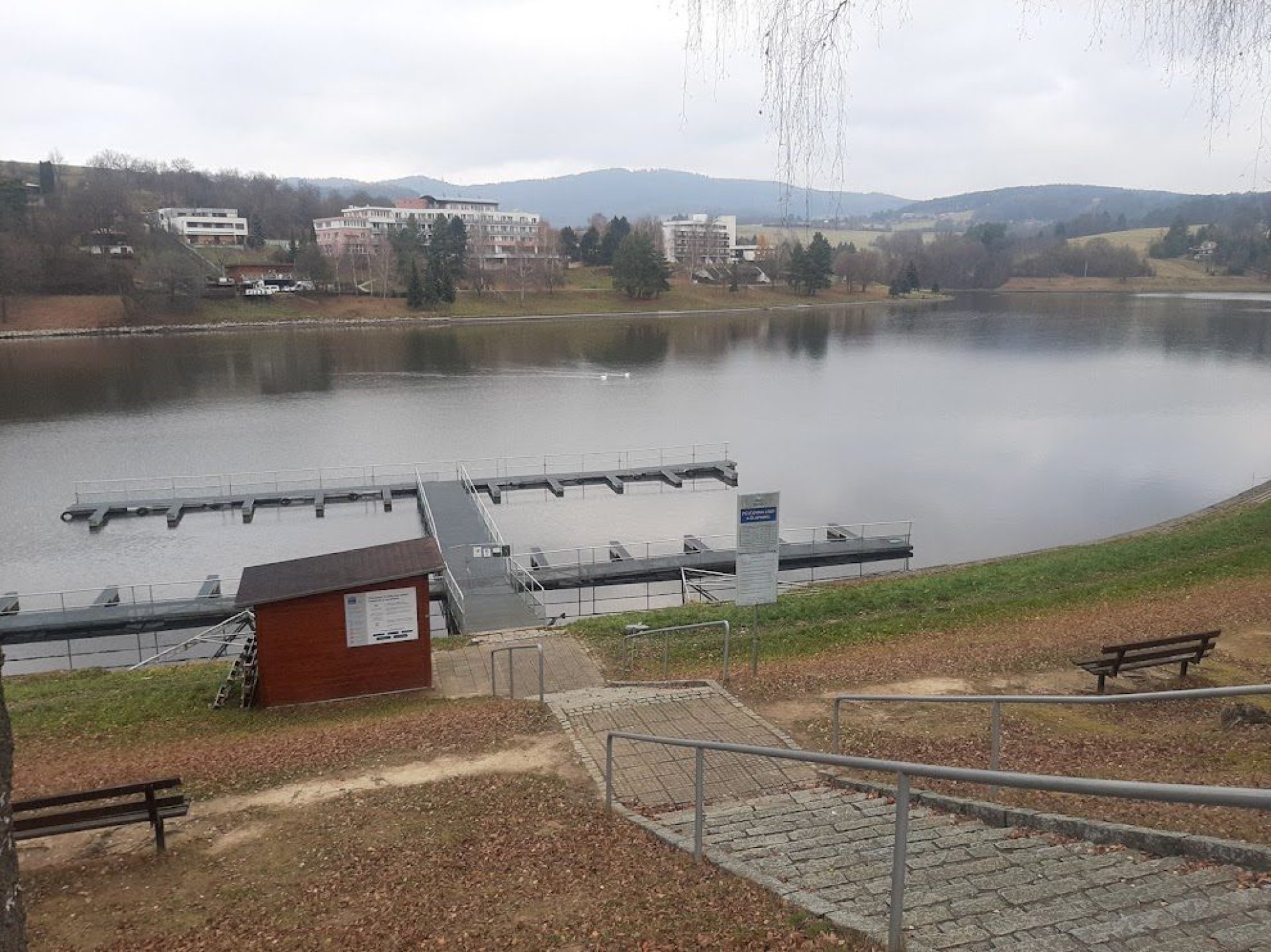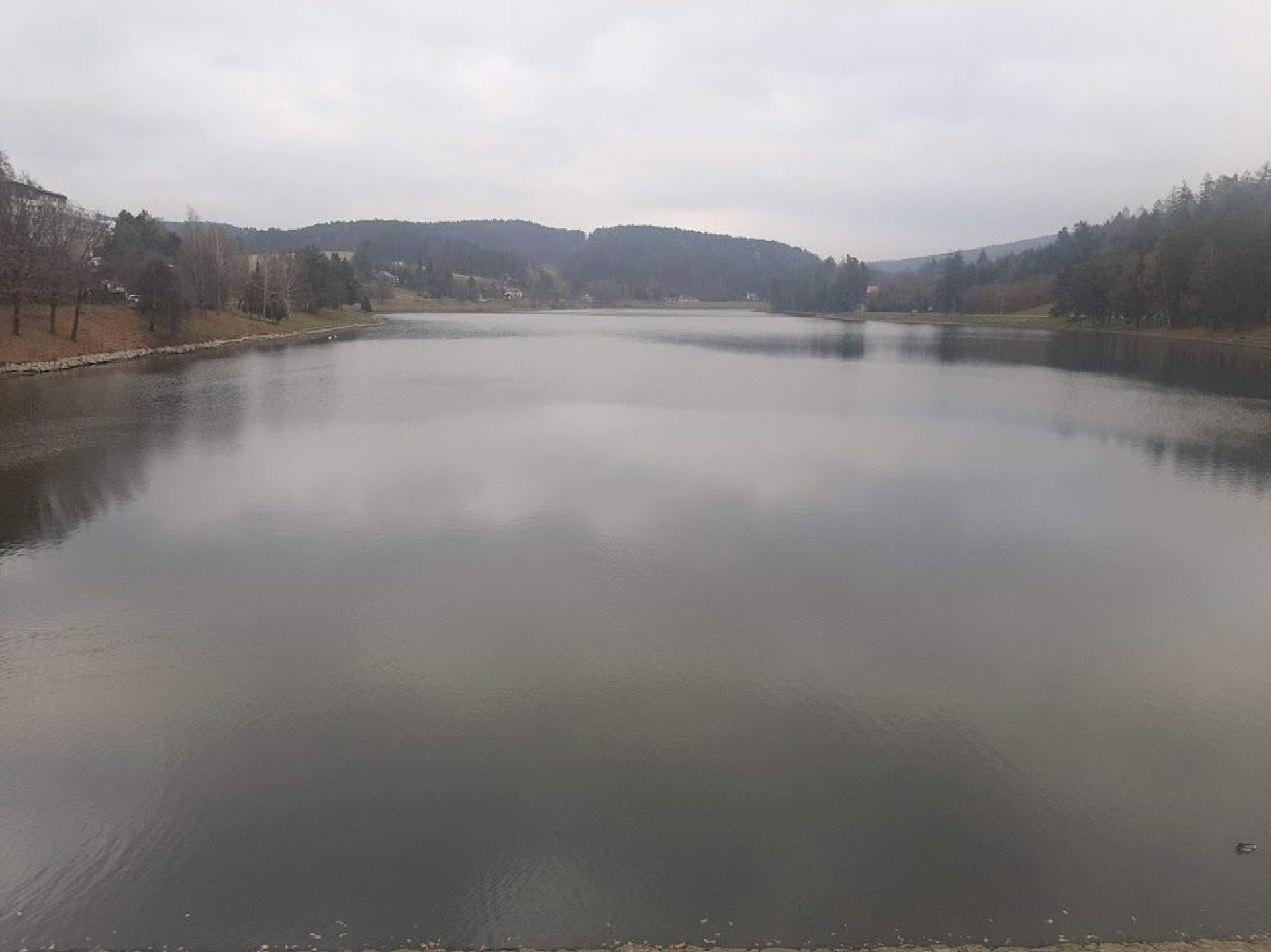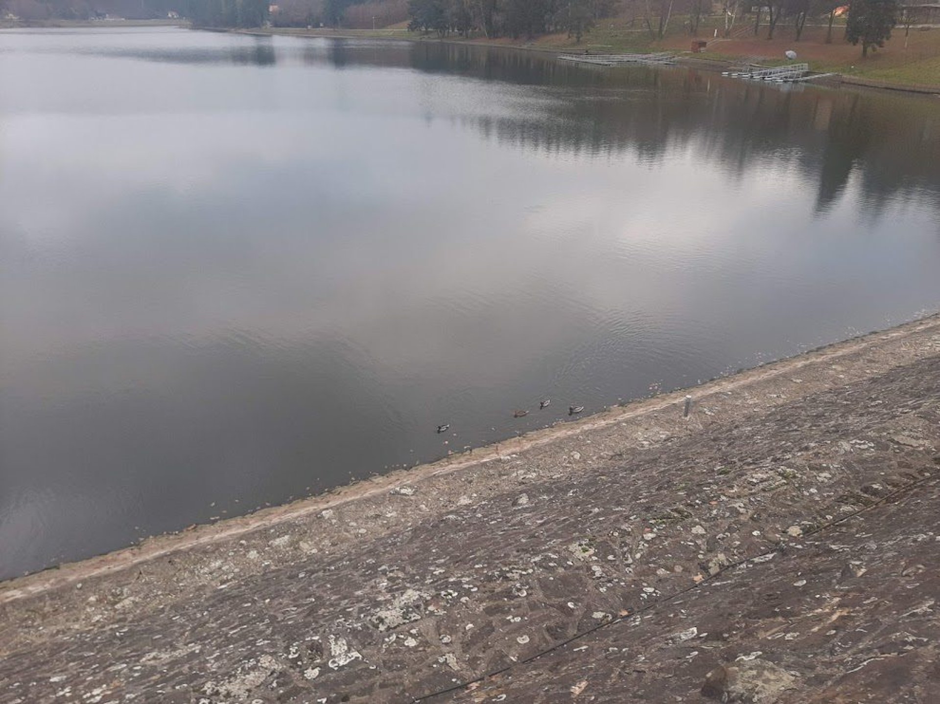 V našem případě na konci ne až tak vlídného listopadu jsou k mání taky dvě osamělé labutě, doufejme, že pár. Jsou hodně zvídavé, připlují až na "omak" a určitě by nepohrdly nějakou dobrotou. Daleko početnější je hejno vodních kachen, tu a tam je na břehu i nějaký ten rybář, ale především je to na rozdíl od letních měsíců naprostá oáza klidu.