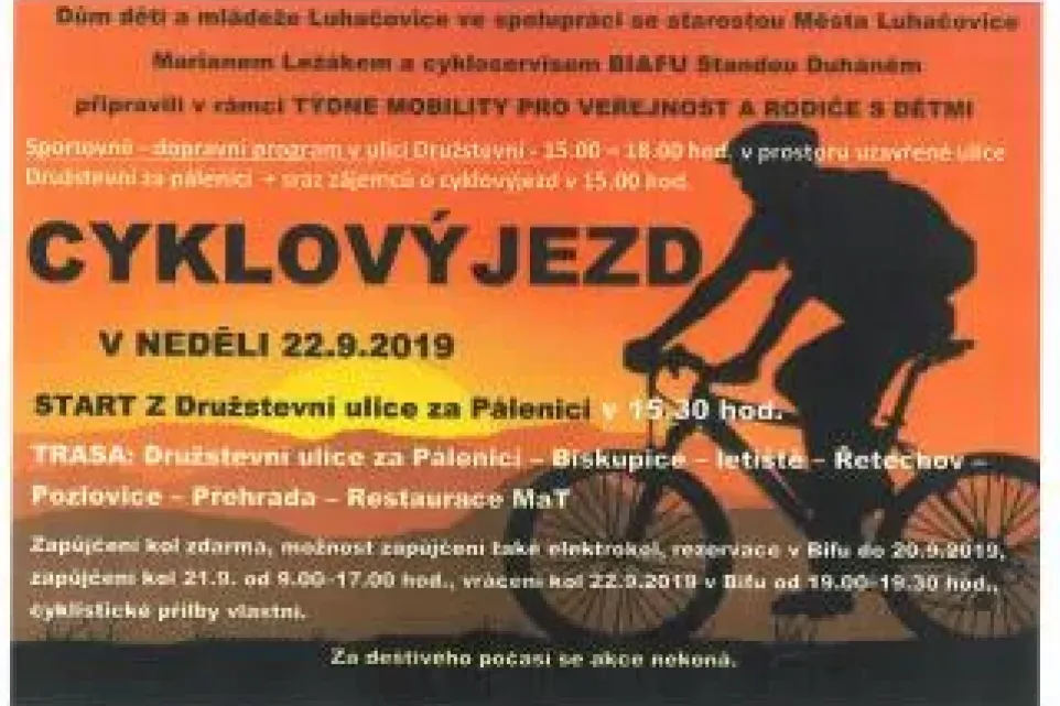 Cyklovýjezd se starostou Luhačovic Marianem Ležákem se uskuteční v rámci Evropského týdne mobility v Luhačovicích, a to při programu ke Dni bez aut v neděli 22. září. Akci pořádá ve spolupráci s městem DDM Luhačovice v koordinaci s cykloobchodem BIFU.