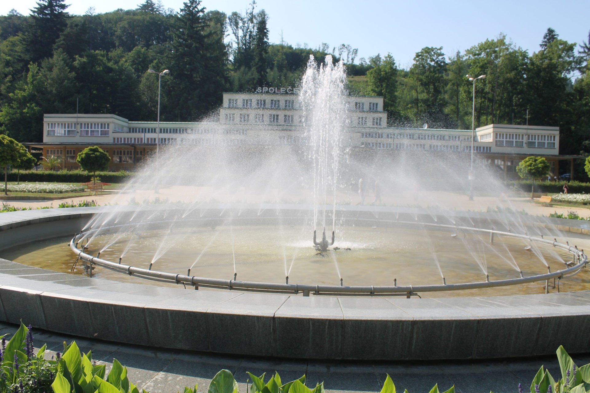 Větší a častěji navštěvovaná je velká fontána umístěna v samém srdci lázní mezi ikonickými objekty, tedy nedávno dokonale opravenou kolonádou a stejně pro Luhačovice nepostradatelným Společenským domem. V parných dnech, ale nejen tehdy, tento symbol Luhačovic minout prakticky nejde. Průhledy vodní tříští doplňuje vlastně všudypřítomná duha a je nasnadě, že se tu dá báječně ochladit.