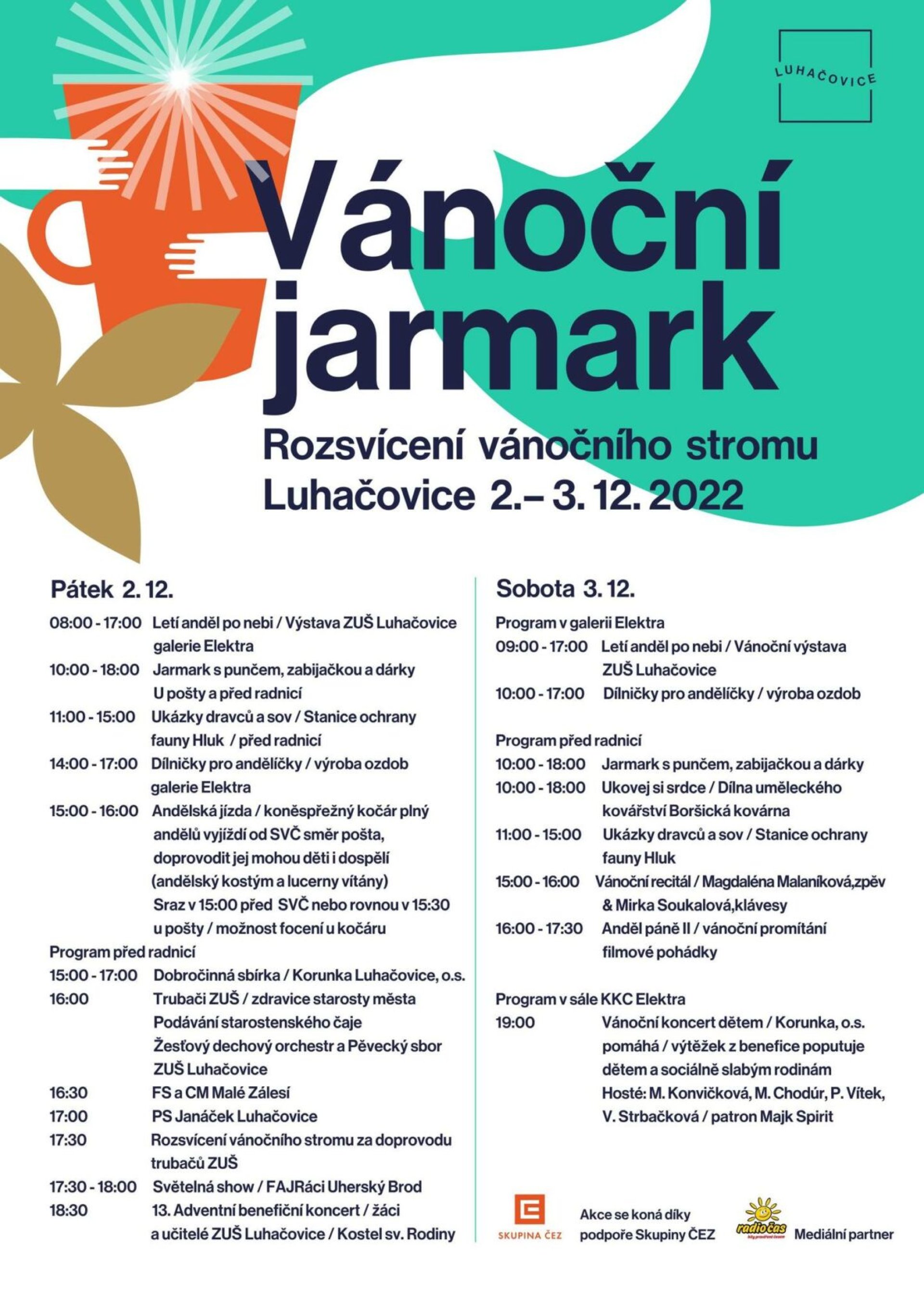 „V pátek se mohou děti a dospělí přijít podívat na ukázku dravců, připraveny jsou dílničky pro děti, Trubači ZUŠ, FS a CM Malé Zálesí, PS Janáček Luhačovice, aj. Důležitou součástí bude dobročinná sbírka Korunka Luhačovice v čase od 15.00 do 17.00 hodin před radnicí,“ upřesnila tisková mluvčí Luhačovic Hana Srncová.