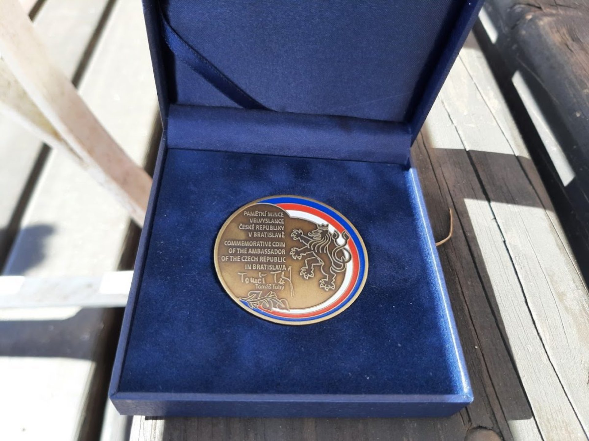Jde o pamětní mince, které jsem s vědomím ministra zahraničních věcí předal, a to tedy moc a moc rád, dvěma přátelům. Generálnímu řediteli Lázní Luhačovice Jiřímu Dědkovi a předsedovi představenstva Eduardu Bláhovi. Oba oceňuji za to, že v dnešní době výrazně pomáhají rozvoji česko-slovenských vztahů.